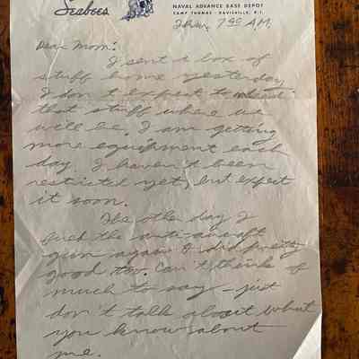 Letter is written on lightweight stationary. At the top of the stationary on the left side is "Seabees. Next to this to the right is the Seabee mascot (the flying Bumblebee with machine gun, hammer and wrench) and finally on the right it reads: