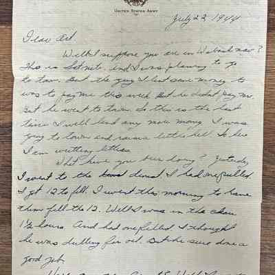 The letter is one page, unlined stationary, with with a brown US Army Eagle log in the top middle and United State Army underneath. Letter is written on both sides of the page.