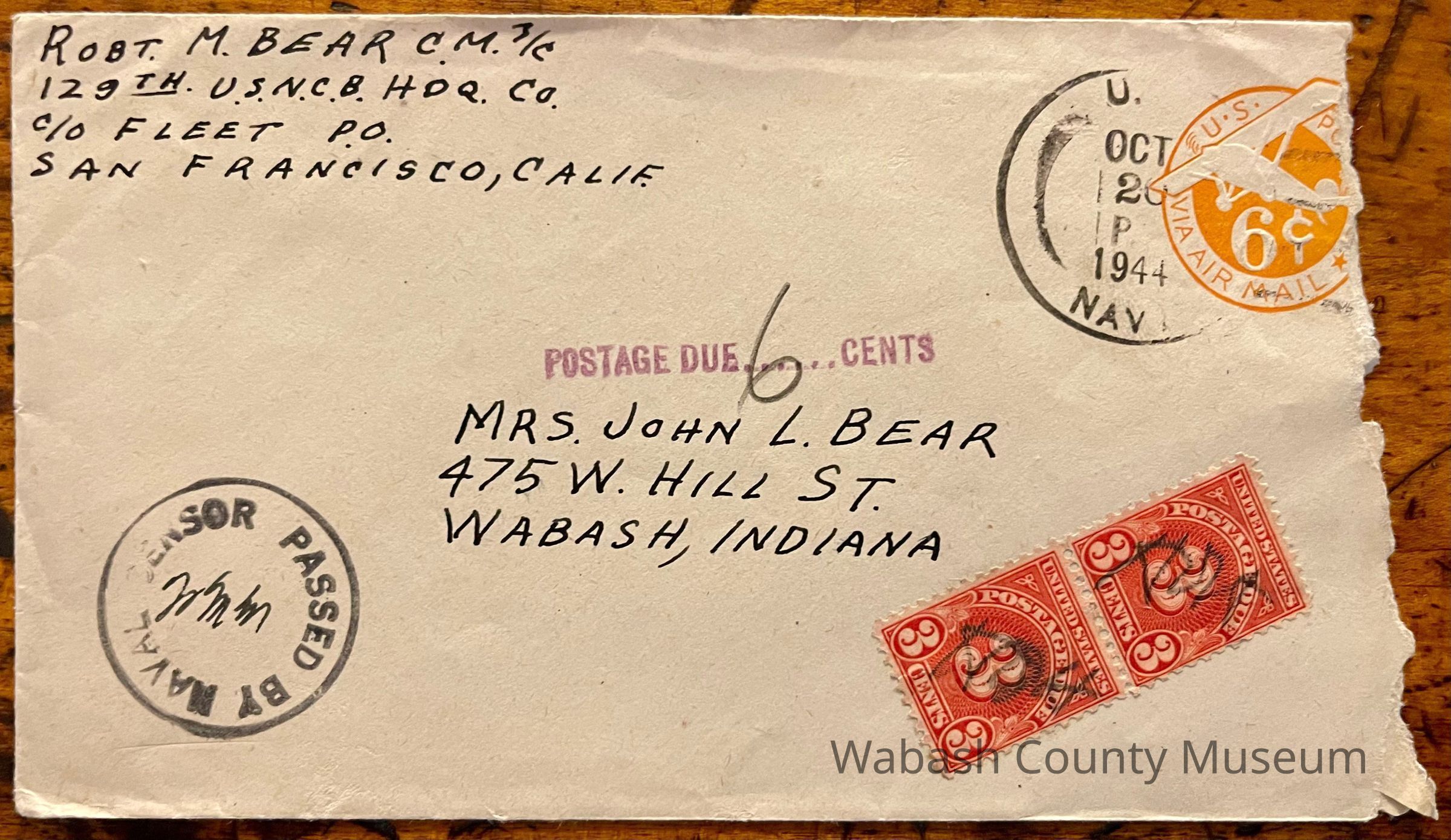 The email is plain white and in lower left corner of envelope is a circle ink stamp reading: Passed by Naval Censor with the censor's initials inside the ink stamp circle. On the right lower side are two red Postage Due stamps, each one 3¢ with initials over each one showing postage page. On the center of the envelope is stamped in purple ink - Postage Due ...... Cents with the number 6 in pencil written in the blank space.