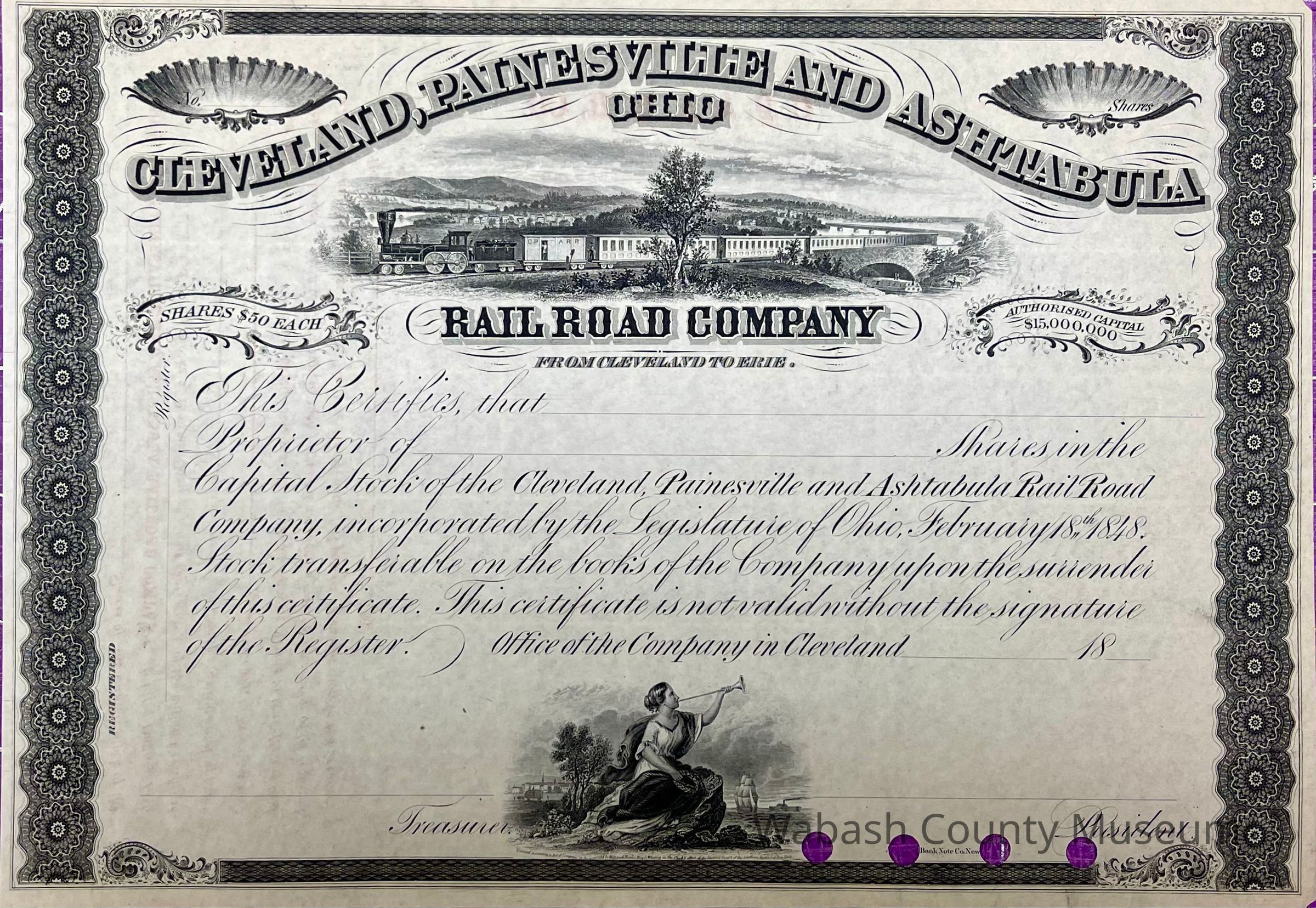 Cleveland Painesville and Ashtabula Railroad Company - Stock Certificate printed in black with a vignette of a locomotive pulling a long line of passenger cars. Above this is"Cleveland Painesville and Ashtabula with Railroad Company directly below the vignette. In each top corner is a half shell where the number of stock is written (right side) and in the other the value of stock (left side). At the bottom in the middle is a vignette of lady on some rocks on a shoreline blowing a trumpet with ships in the background. This certificate is unissued and unsigned.