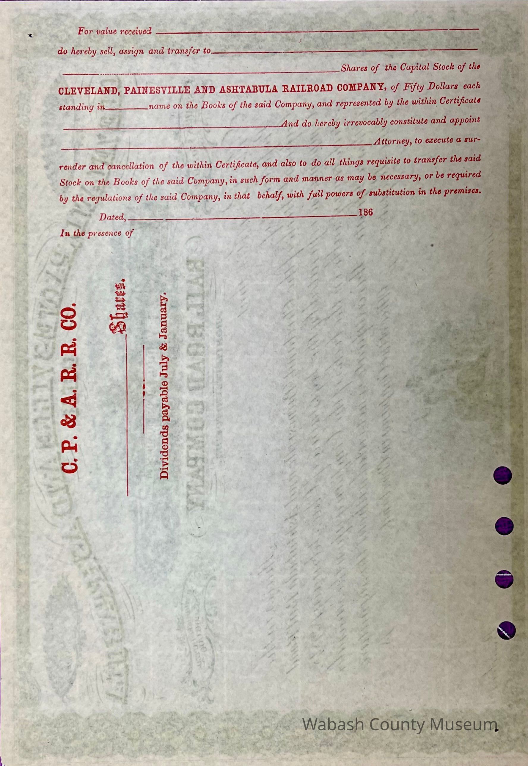 Cleveland Painesville and Ashtabula Railroad Company - Stock CertificateEntry/Object ID