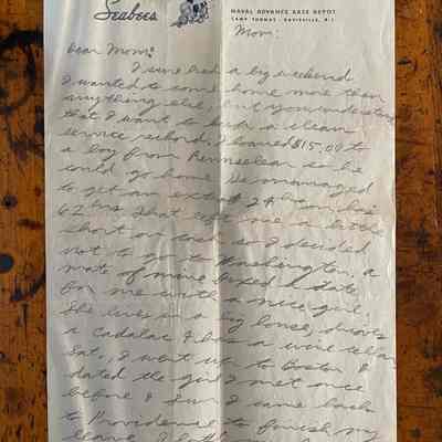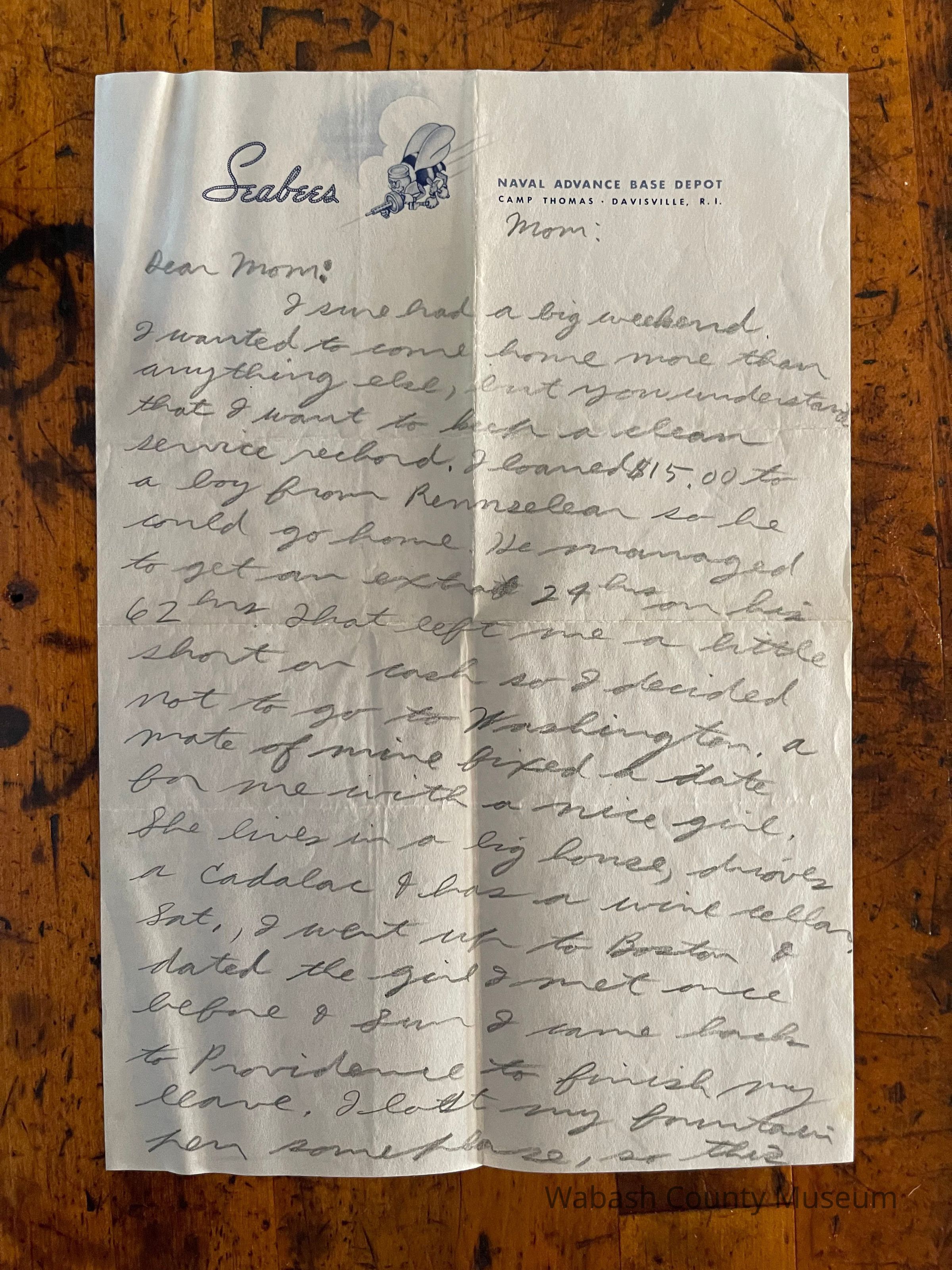 Letter is written on lightweight stationary. At the top of the stationary on the left side is "Seabees. Next to this to the right is the Seabee mascot (the flying Bumblebee with machine gun, hammer and wrench) and finally on the right it reads: