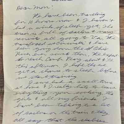 Letter is written on plain white paper. At the top is a blue Eagle holding arrows and a feather in its talons. Underneath the eagle it reads United States Army with the Army crossed out and hand written in it says Navy.