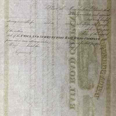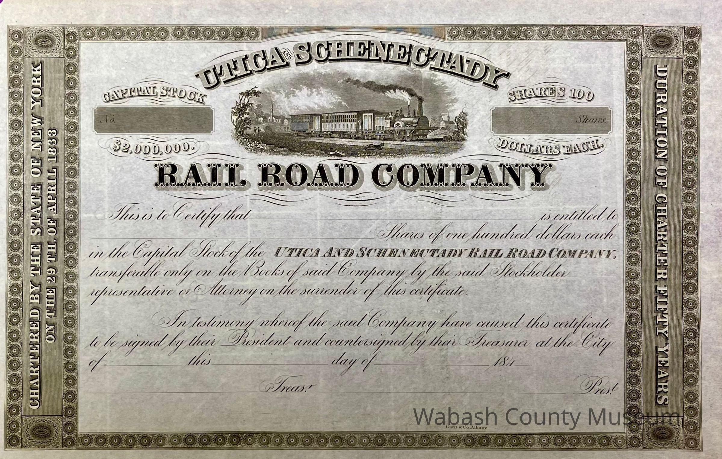 Utica Schenectady Rail Road Company - Stock Certificate printed in black. At the top is a vignett of a passenger train moving left to right. Above this is Utica Schenectady and below it is Rail Road Company. This certificate is unsigned and unissued.