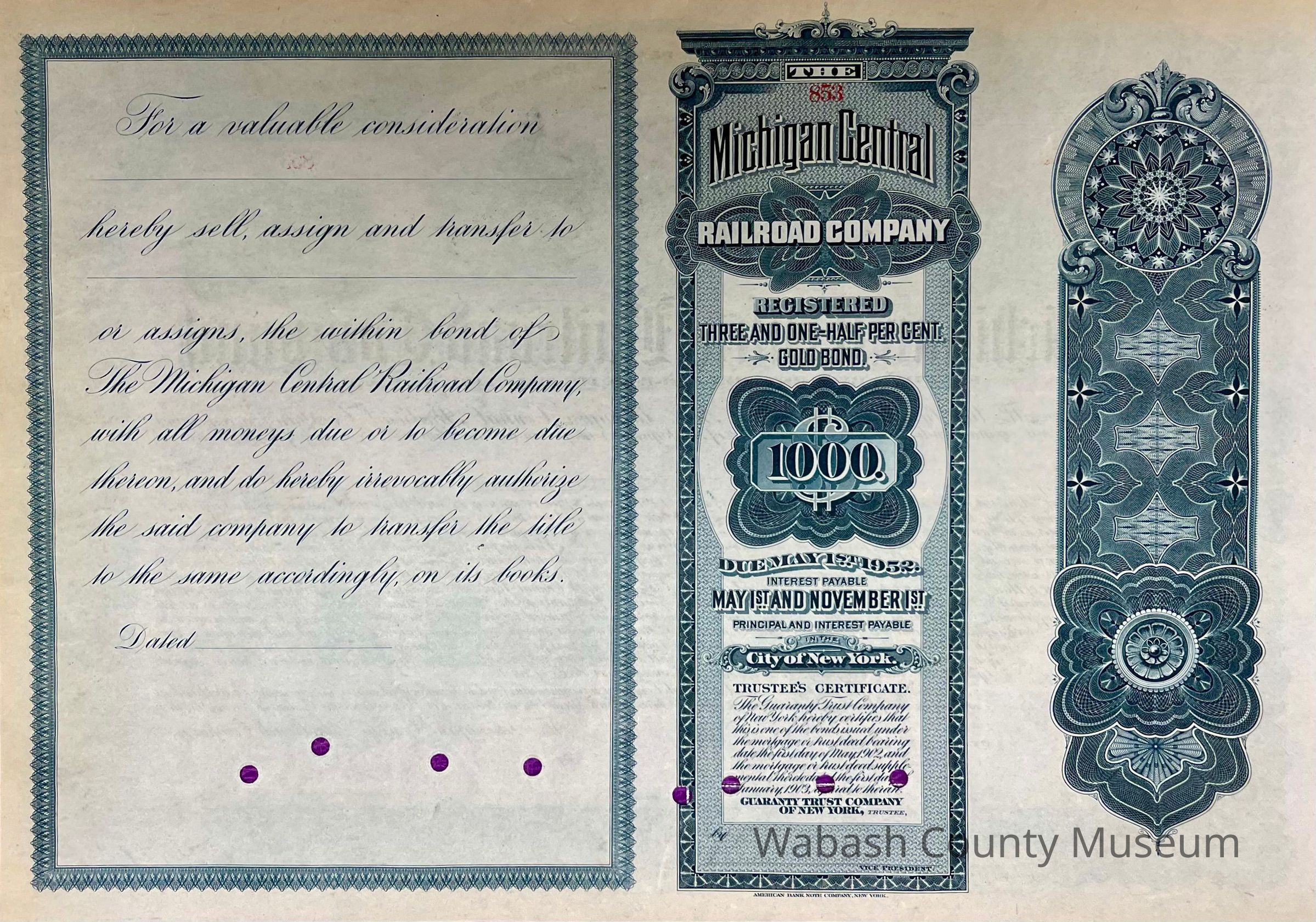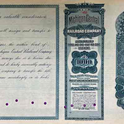 The Michigan Central Railroad Company - Stock Certificate printed in green ink. Certificate is unissued and is cancelled. No. 853. $1,000 Green Gold Coin Bond printed by American Bank Note Co., New York. Elaborate vignette of a passenger train at a depot in the top middle.