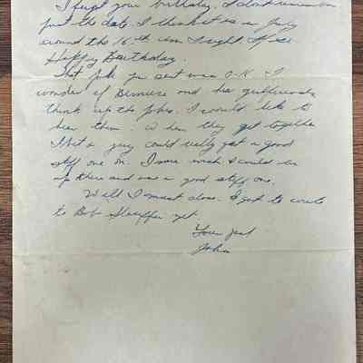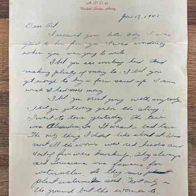 The letter is one page, unlined stationary. The envelop has under the return address a red embossed Crossed Cannons with United States Army written above them. The letterhead for the stationary show crossed cannons and underneath them, Battery "A" 920 Field Artilley Battalion, APO 95, United States Army. Letter is written on both sides of the page.