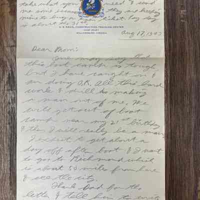 Letter is written on plain white paper. At the top is letterhead showing the emblem of the SeaBees (a flying bumblebee shooting a machine gun). Around the emblem in a circle is a rope and in behind everything are crossed anchors. Underneath it reads U.S. Naval Construction Training Center, Camp Peary, Williamsburg, Virginia