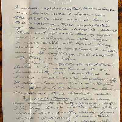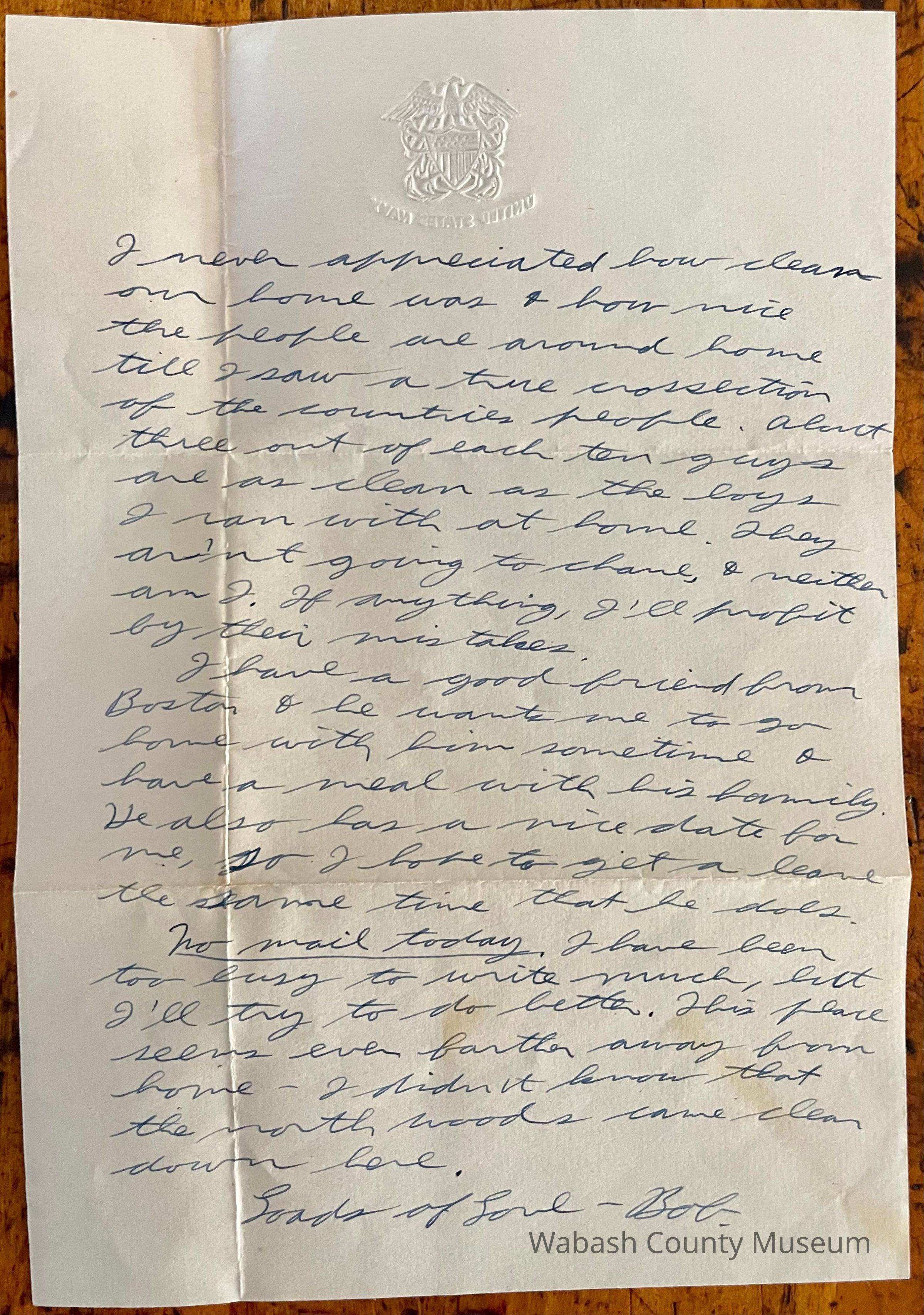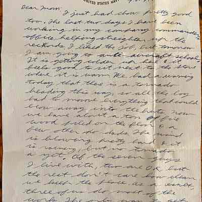 Letter is written on plain white paper with a golden eagle and shield with crossed anchors. Underneath it reads United States Navy. It is hand written, unlined and one page in length and written on both sides