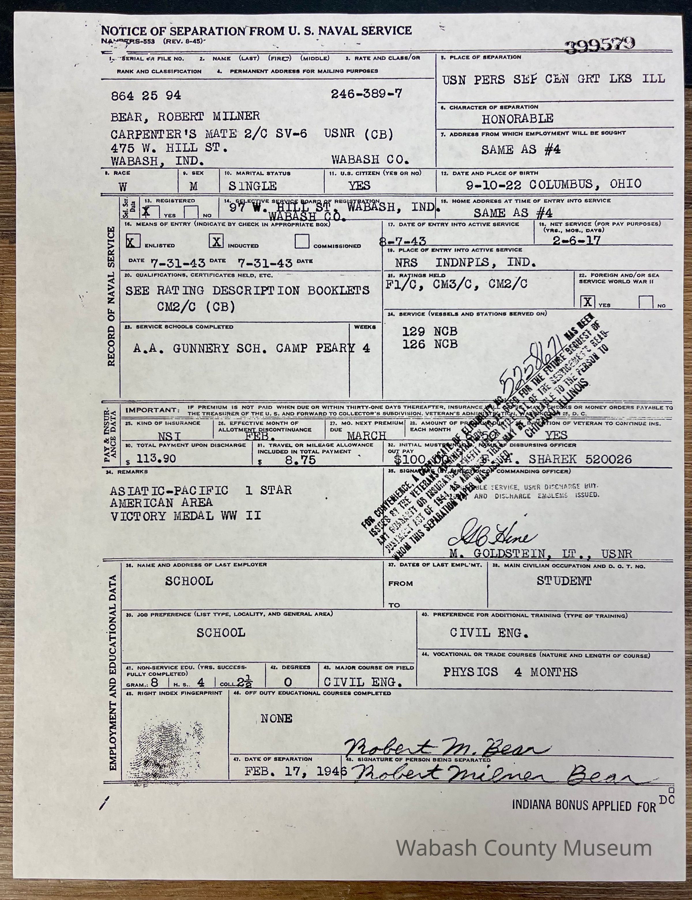 Robert Milner Bear - Notice of Separation From U.S. Naval Service (Contains ink Stamp for Benefit Eligibility)
