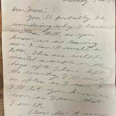 Letter - Robert Milner Bear to Mom, Mrs. John L. Bear (Sep 6, 1943 - Tuesday 3:35PM)Entry/Object ID