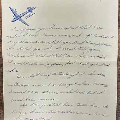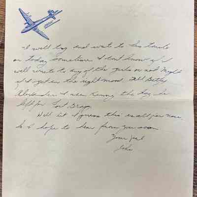 The letter is three pages, with an embossed blue airplane looking like it is on an attack run in the top left corner, and written on one side in cursive.
