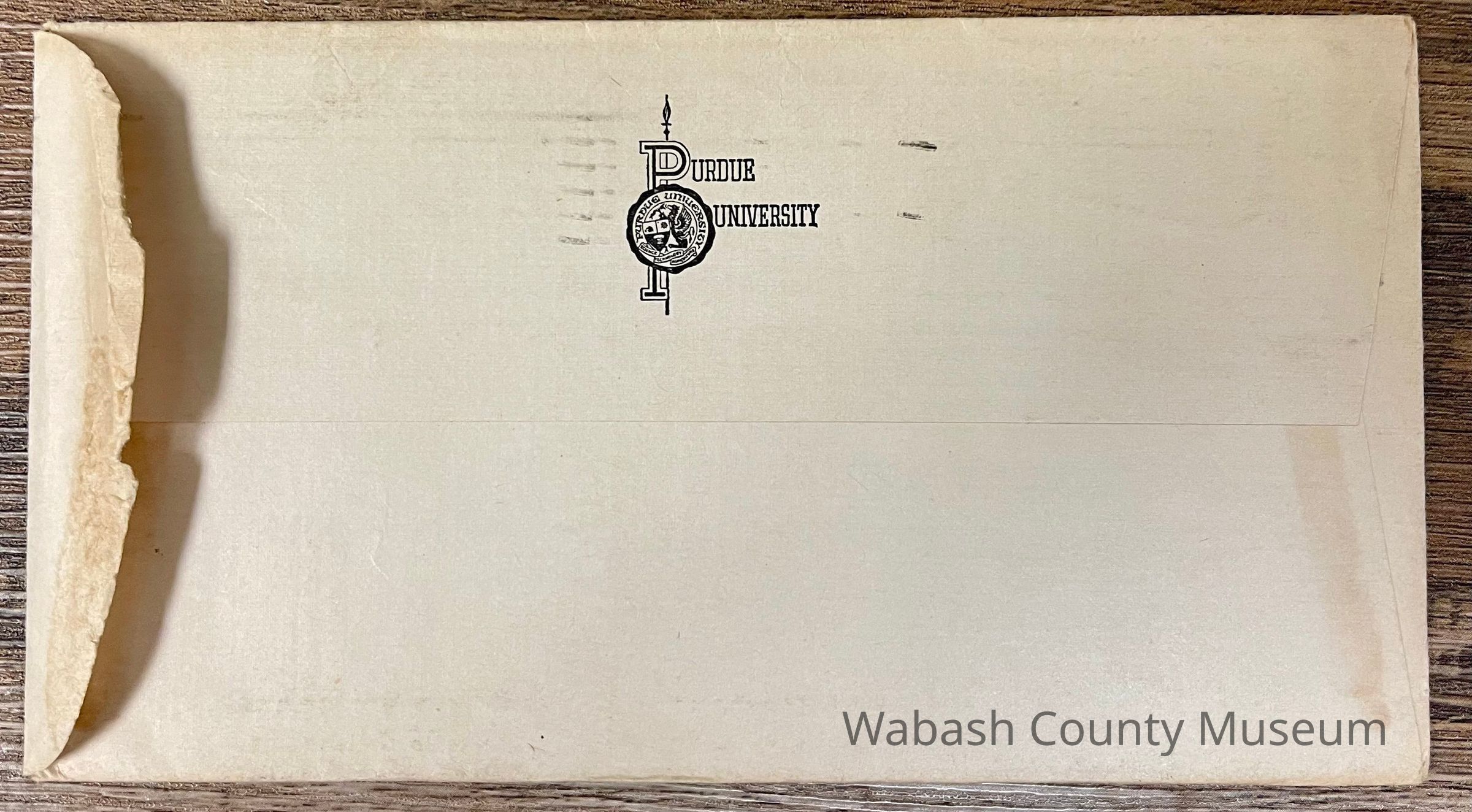 On the back of the envelope it reads Purdue University with the Purdue seal over the top of the letters.