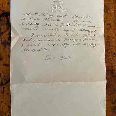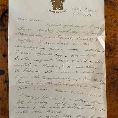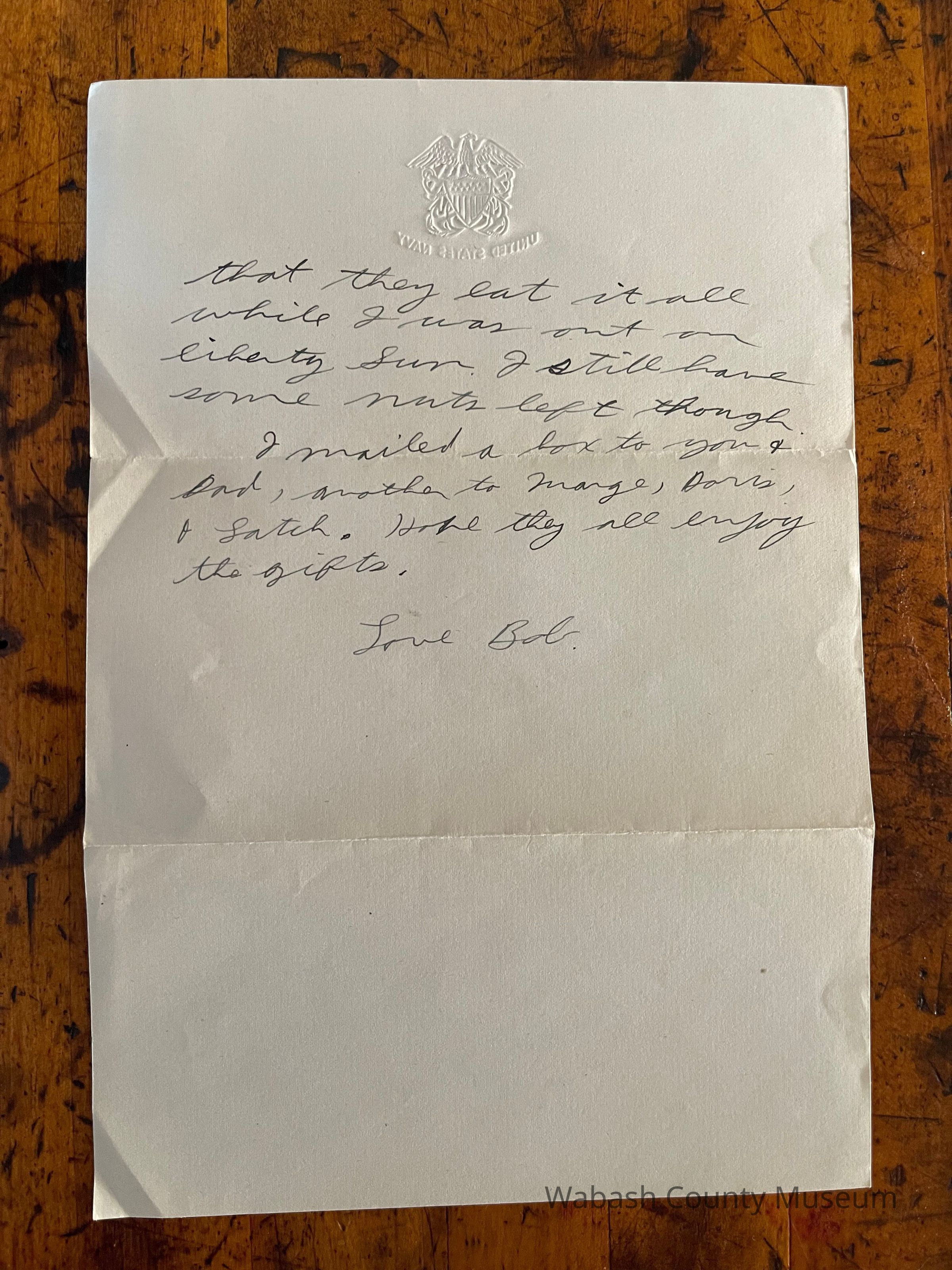 Letter is written on plain white paper with a golden eagle an shield with crossed anchors. Underneath it reads United States Navy. It is hand written, unlined and one page in length and written on both sides.