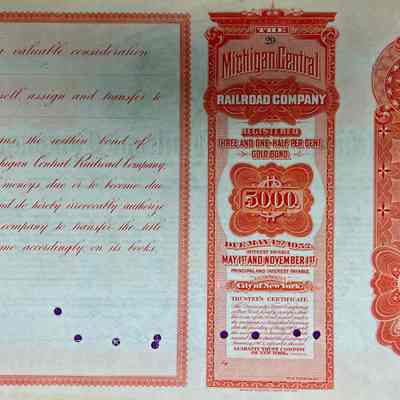 The Michigan Central Railroad Company - Stock Certificate printed in orange ink. Certificate is unissued and is cancelled. No. 29. $5,000 Orange Gold Coin Bond printed by American Bank Note Co., New York. Elaborate vignette of a passenger train at a depot in the top middle.