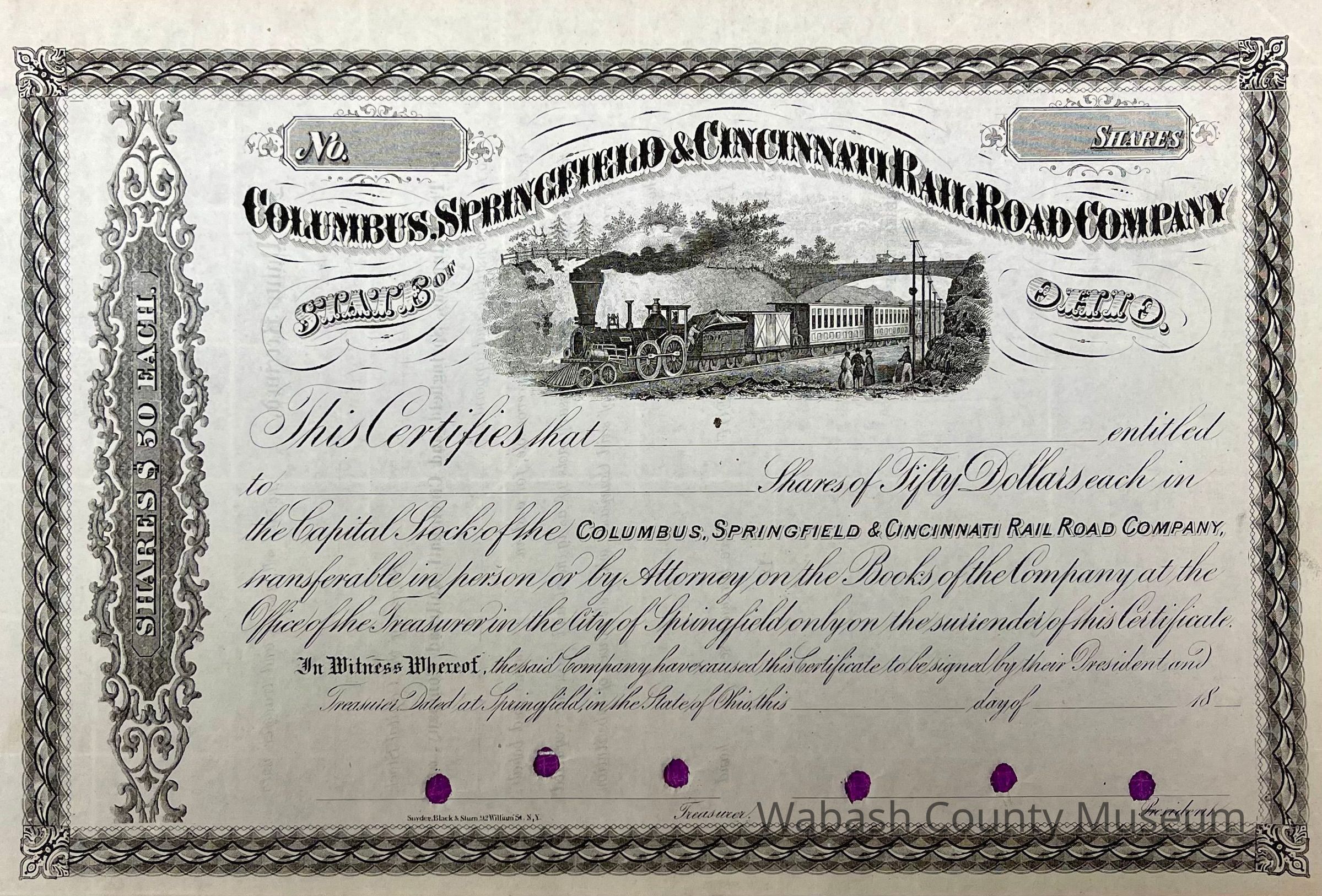 Columbus, Springfield & Cincinnati Railroad Company - Stock Certificate printed in black with a vignette of an old passenger locomotive pulling several passenger cars. Across the top of the certificated is Columbus, Springfield & Cincinnati Railroad Company. On the left side it reads "Shares $50.00 Each". Certificate is unsigned and unissued.
