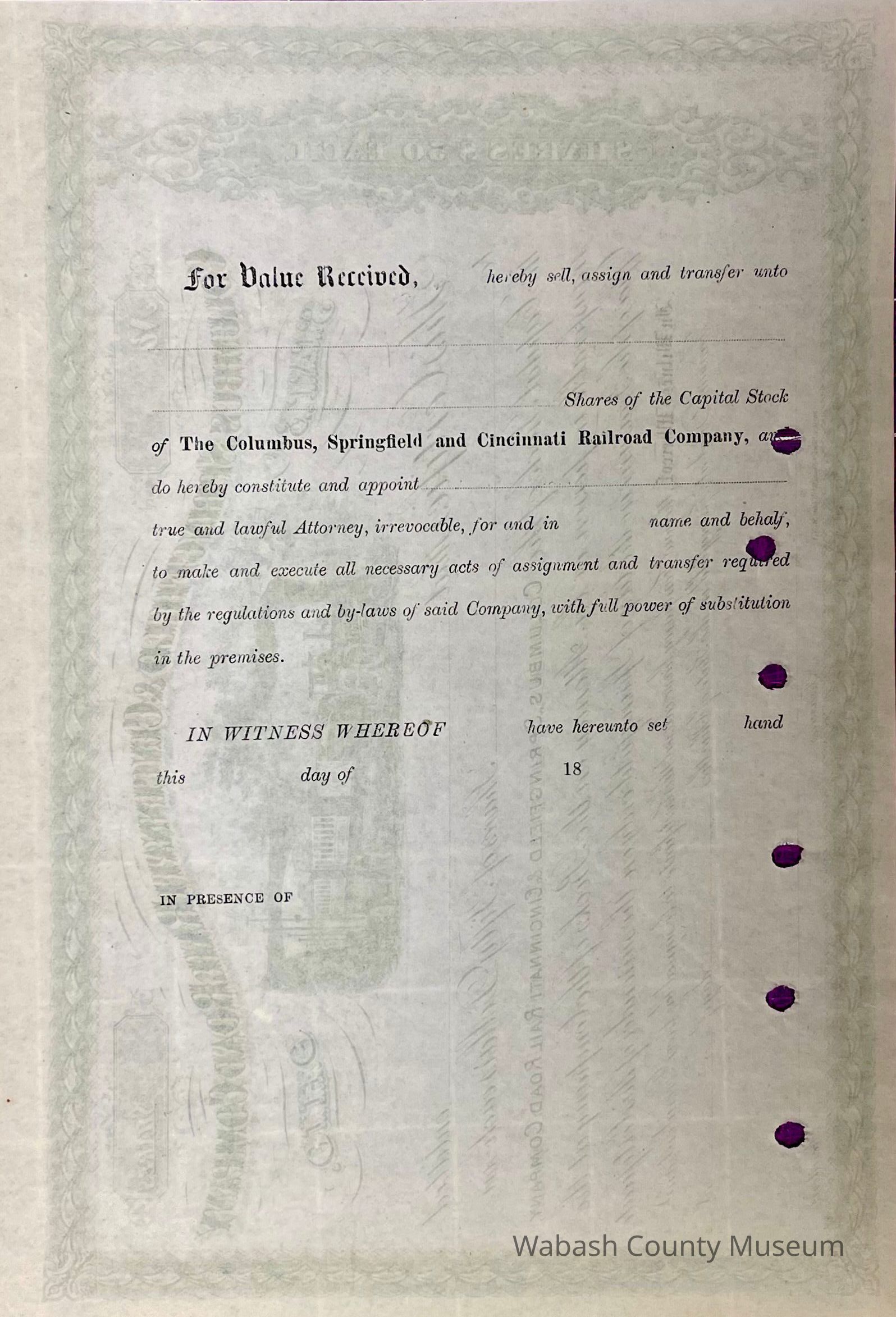 Columbus, Springfield & Cincinnati Railroad Company - Stock Certificate