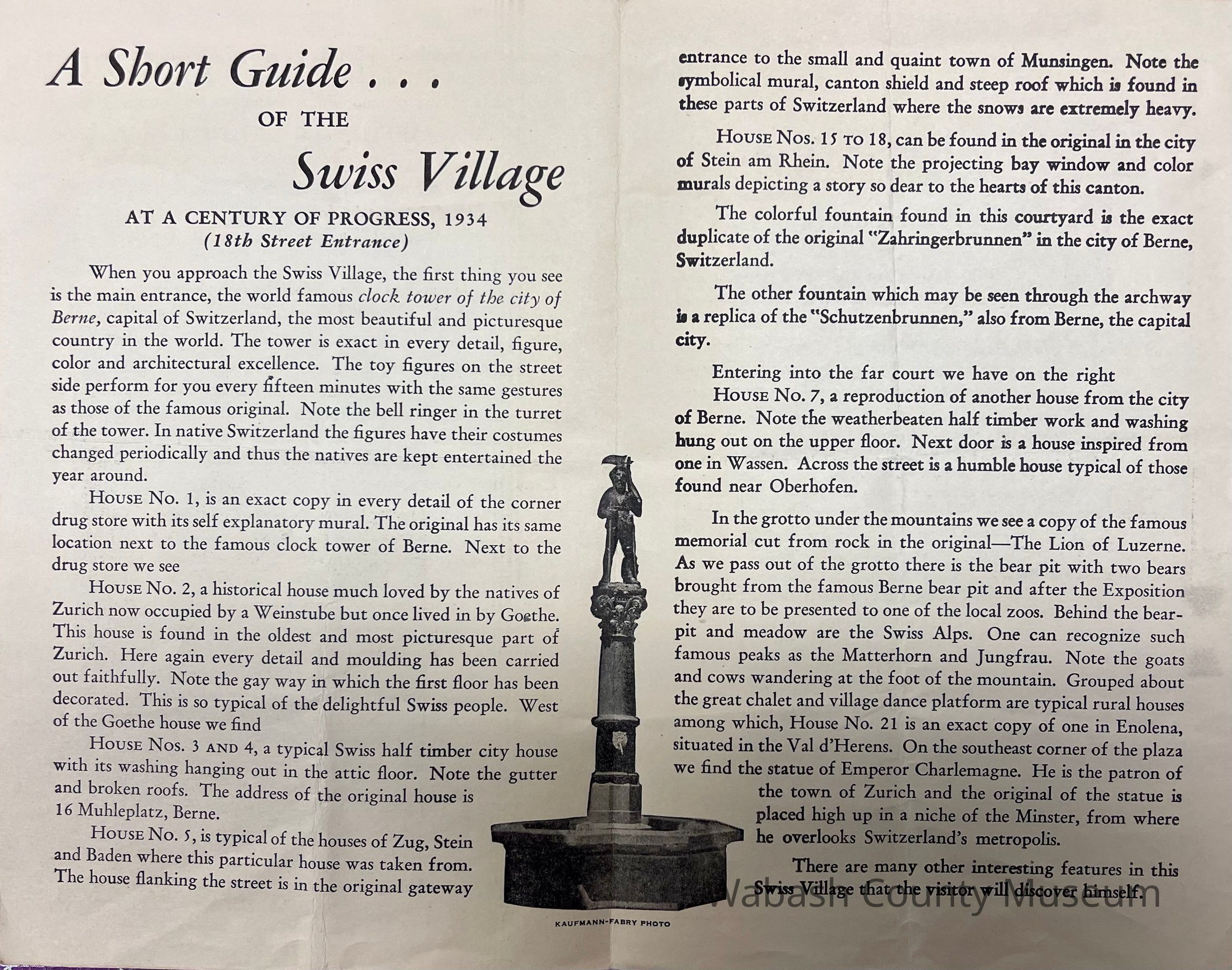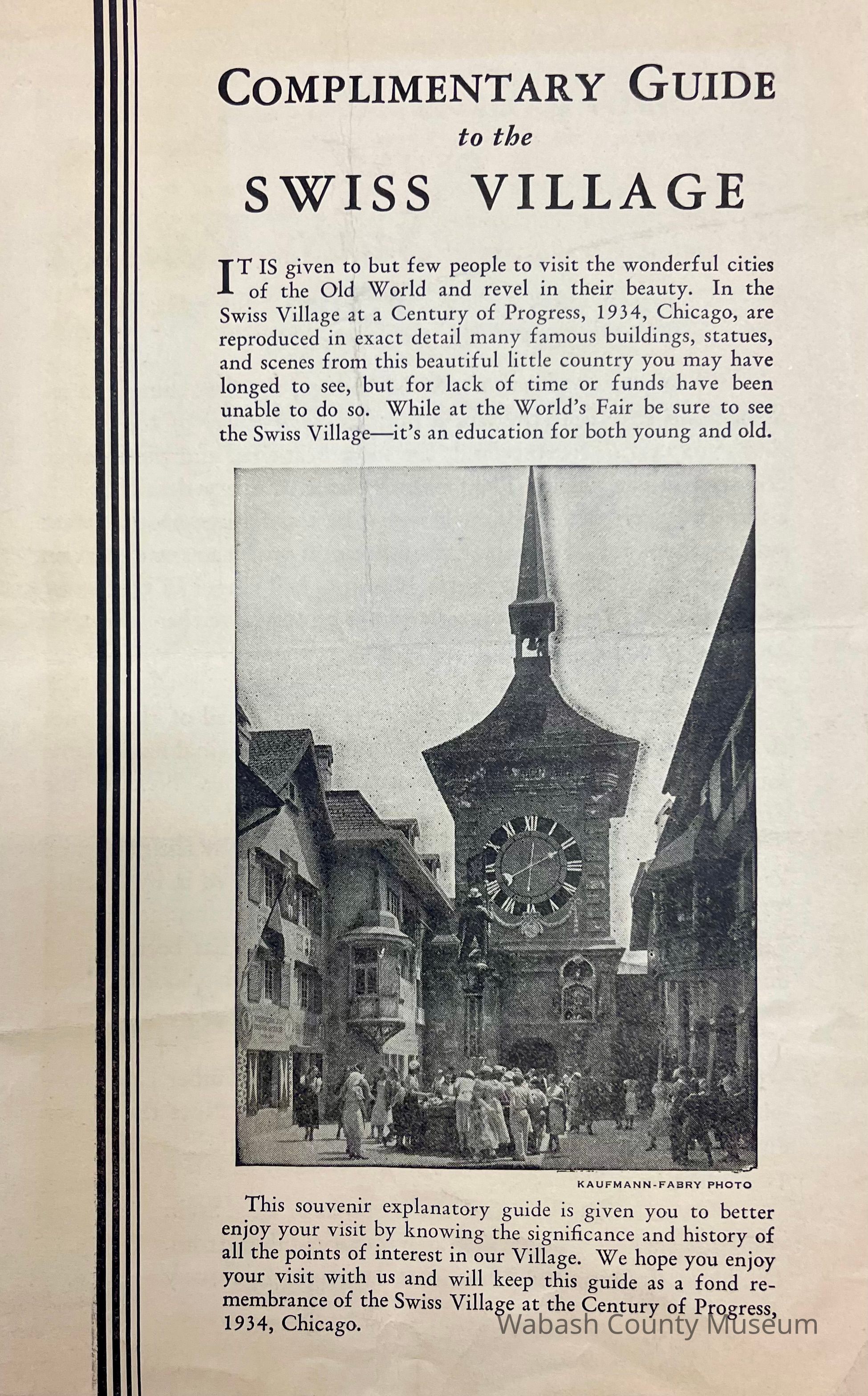 Souvenir explanatory guide given to visitors of the Swiss Village at the 1934 Chicago World's Fair to explain the significance and history of all points of interest in the village.