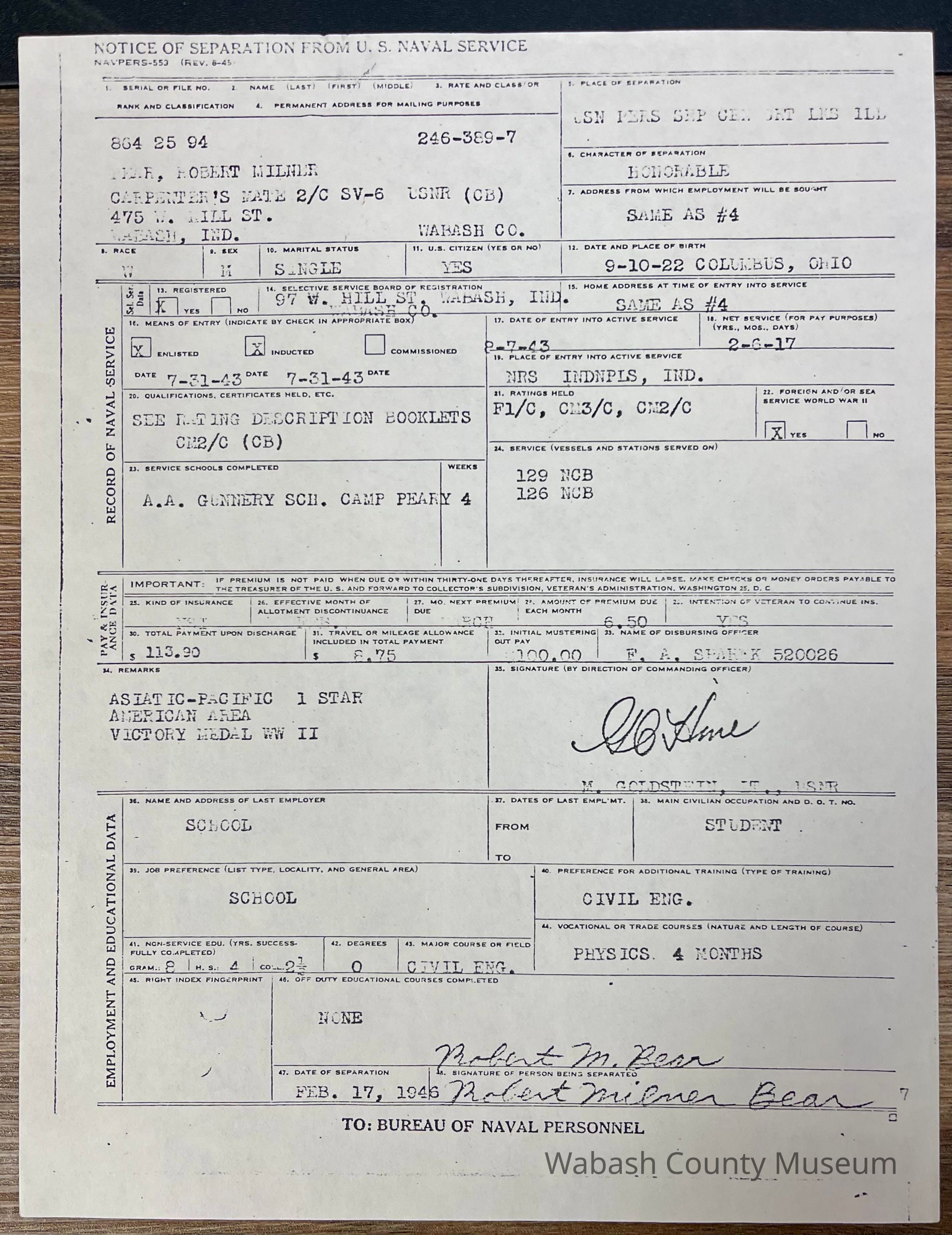 Robert Milner Bear - Notice of Separation From U.S. Naval Service