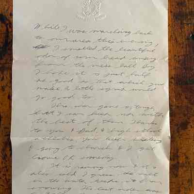 Letter is written on plain white paper with a golden eagle an shield with crossed anchors. Underneath it reads United States Navy. It is hand written, unlined and one page in length and written on both sides.