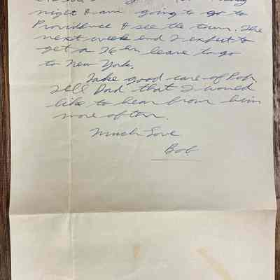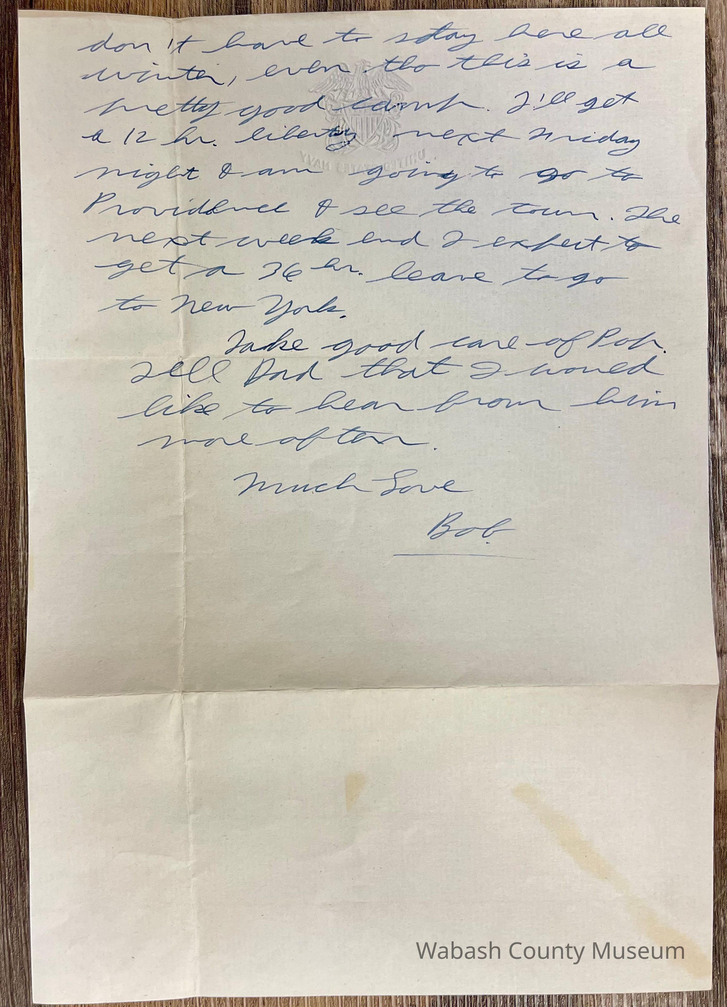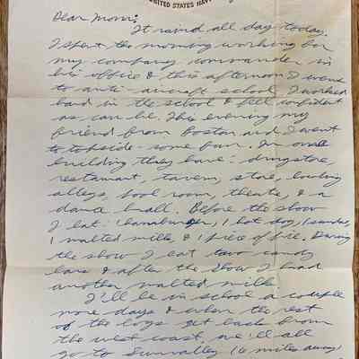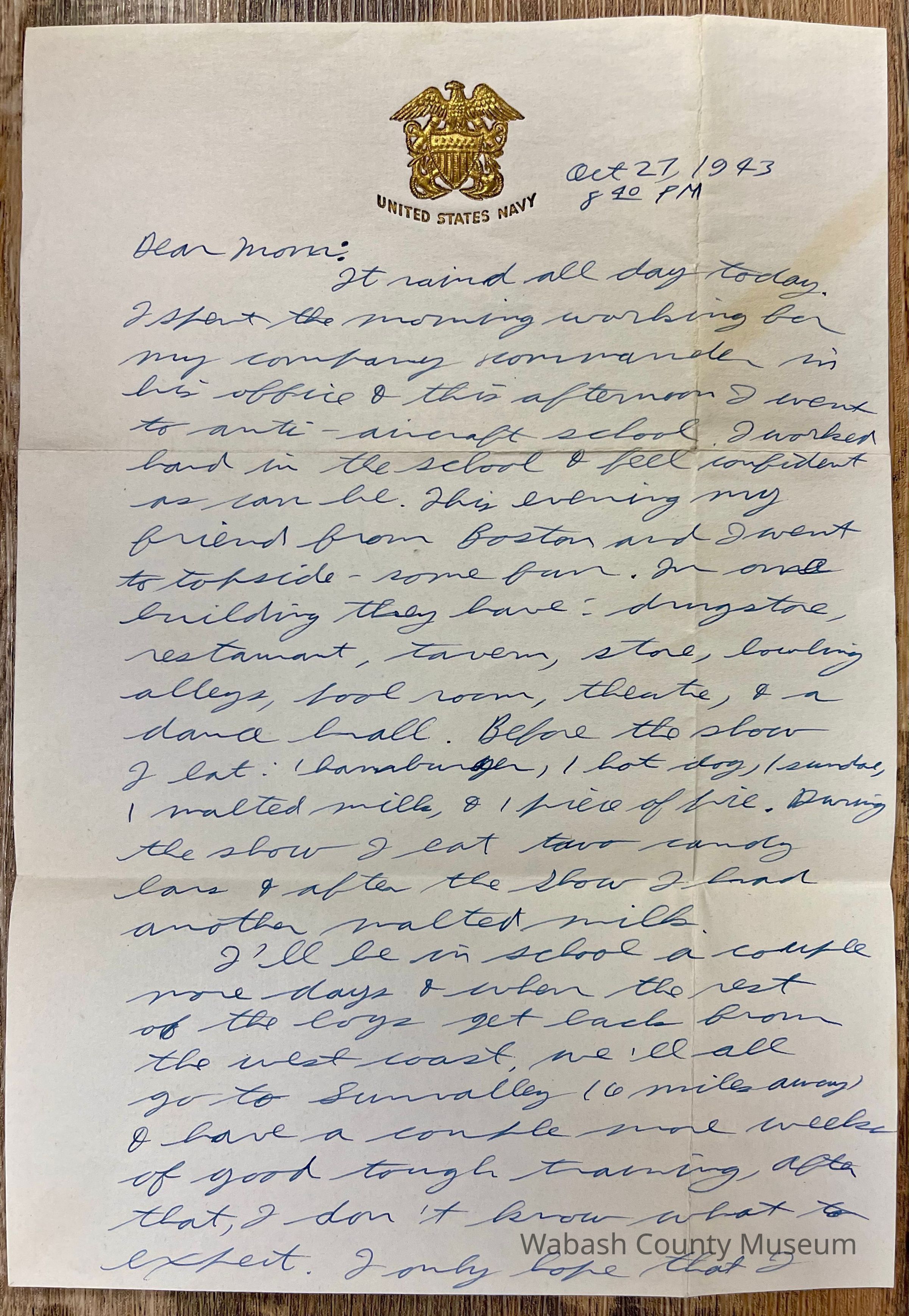 Letter is written on plain white paper with a golden eagle an shield with crossed anchors. Underneath it reads United States Navy. It is hand written, unlined and one page in length and written on both sides.