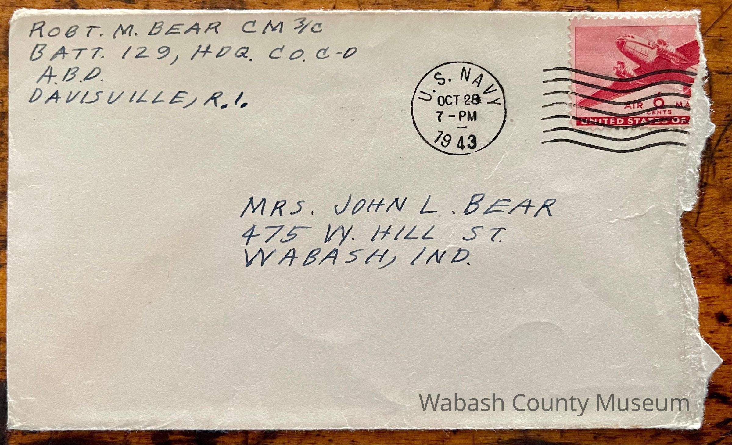 Postmark on envelope reads: US Navy, Oct. 28, 1943 | 7:00PM