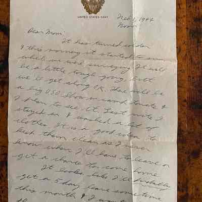Letter is written on lightweight stationary with a golden eagle and shield. Underneath it reads United States Navy. It is hand written, unlined and one page in length and written on both sides