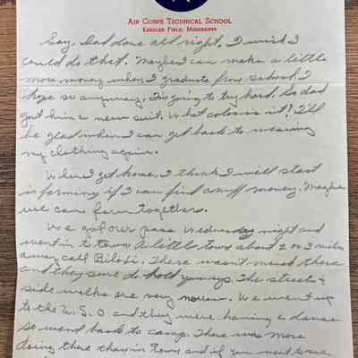 The letter stationary is all labeled at the top with the US Army Air Force round emblem with blue field. On this is a 5 sided star with a red center making the Army Air Force Star and then a pair of golden wings coming off of the star. Underneath this in red ink it reads: Army Air Corps Technical School; Keesler Field, Mississippi.