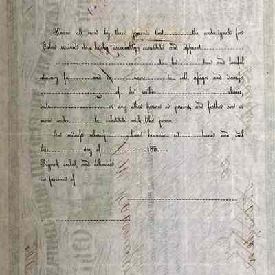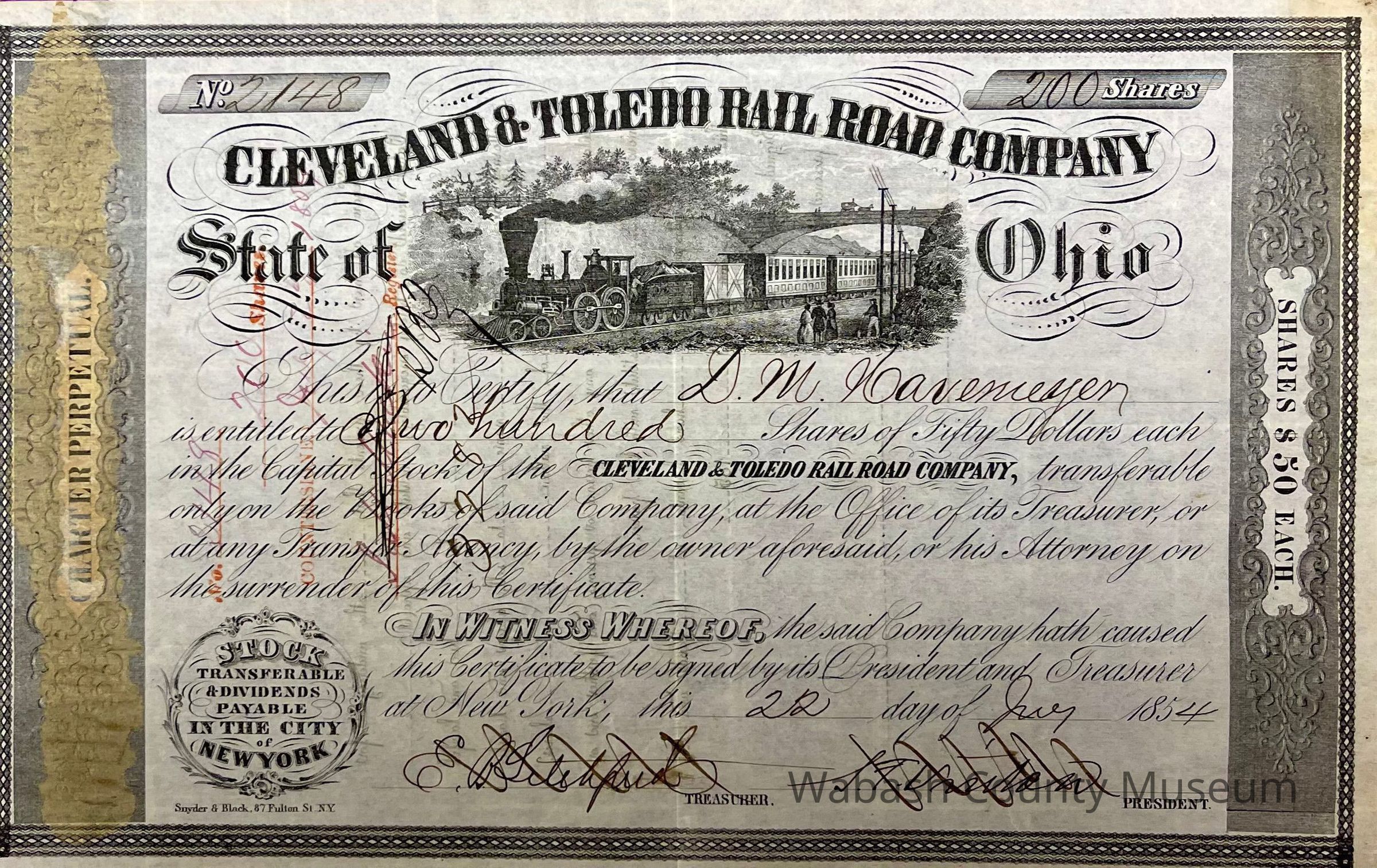 Stock Certificate (200 Shares) from the Cleveland & Toledo Rail Road Company. Vignette of a Steam Locomotive pulling a line of passenger cars. Certificate number 2148, it is printed in black and was manufactured by Snyder, & Black, NY. Issued in July 22, 1854. States in the bottom left corner, "Stock transferable & dividends payable in the city of New York."