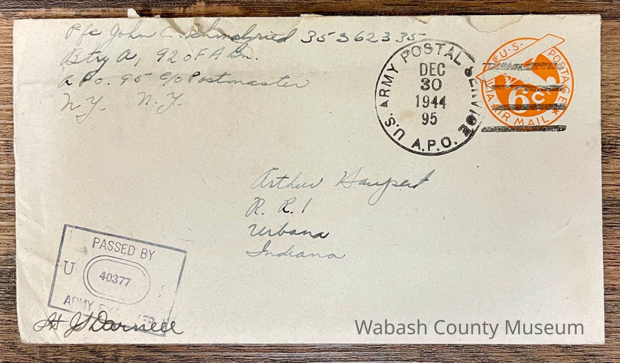 The top middle right by the stamp of the envelope is the postmark reading: US Army Postal Service APO 95, Dec. 30, 1944.