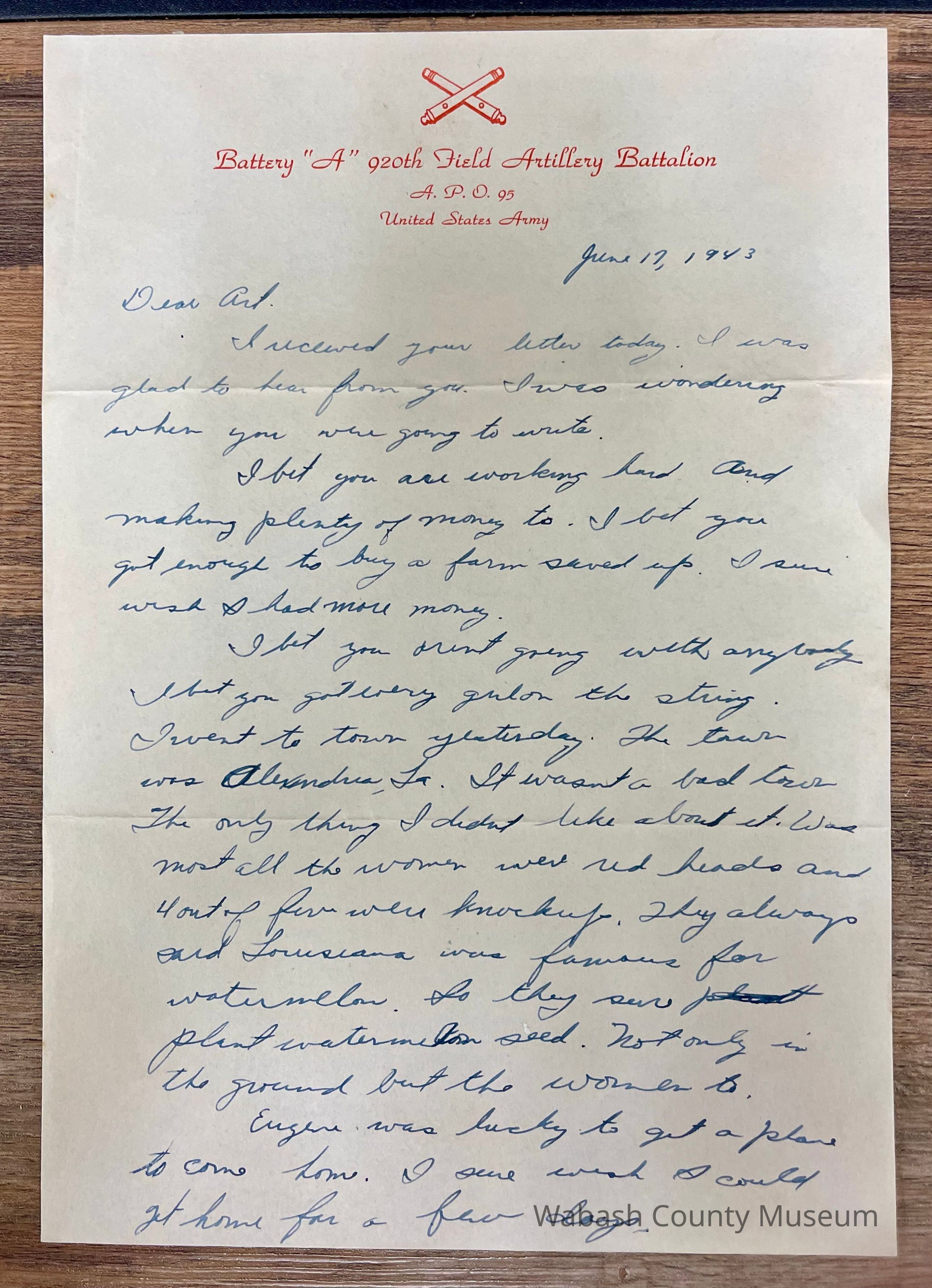 The letter is one page, unlined stationary. The envelop has under the return address a red embossed Crossed Cannons with United States Army written above them. The letterhead for the stationary show crossed cannons and underneath them, Battery "A" 920 Field Artilley Battalion, APO 95, United States Army. Letter is written on both sides of the page.