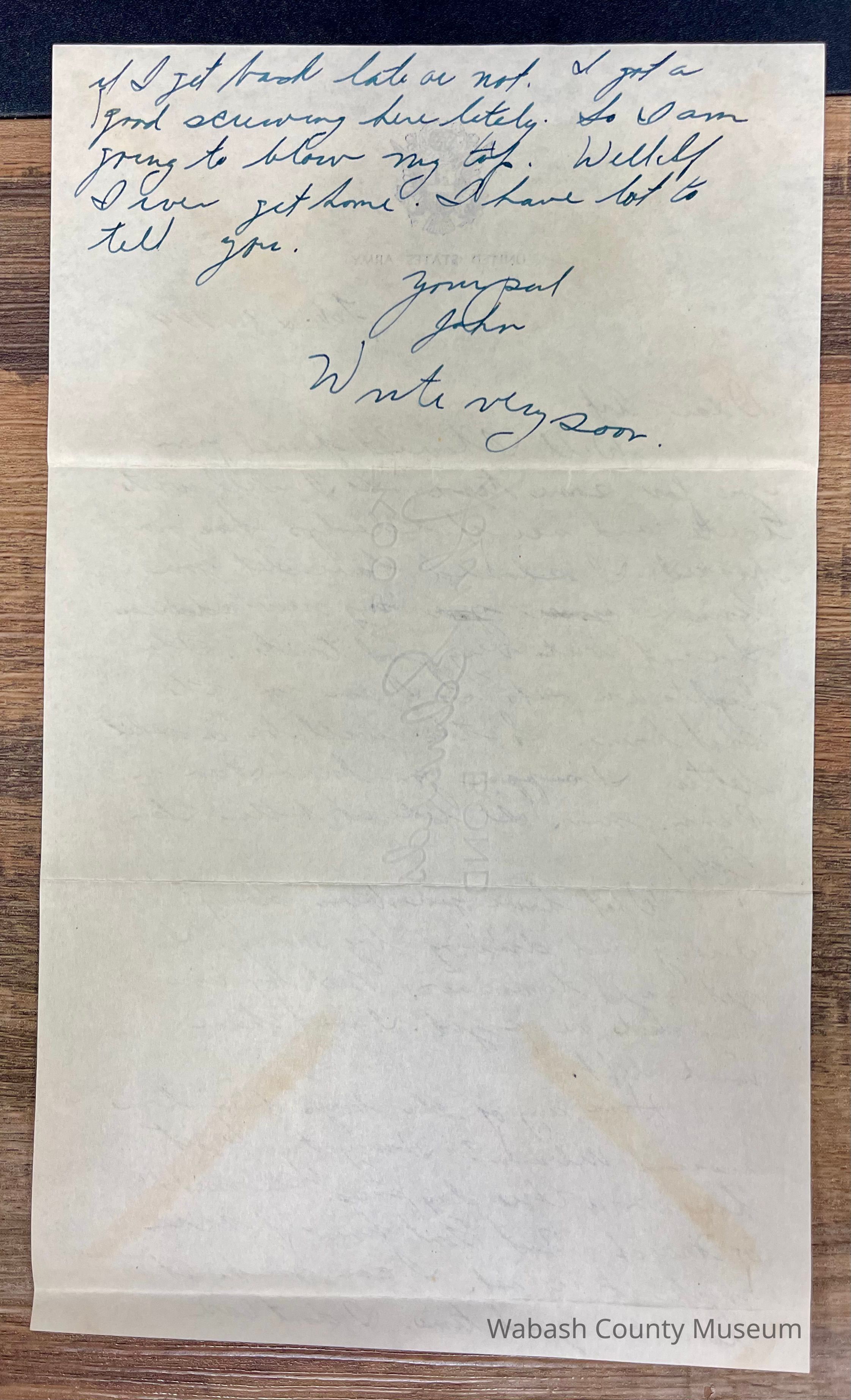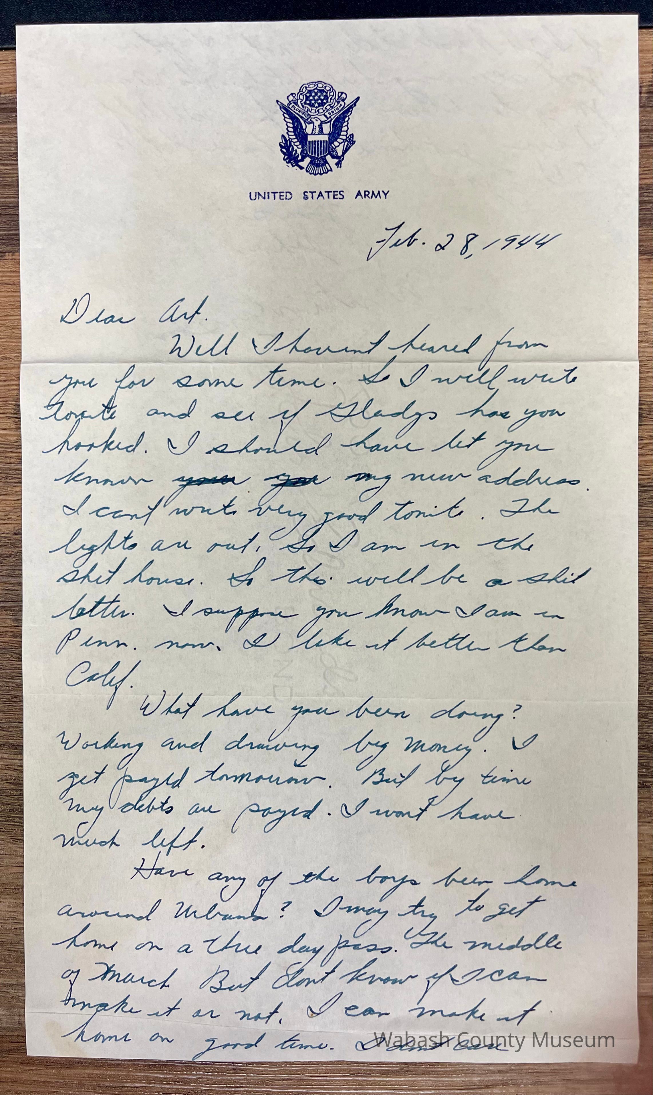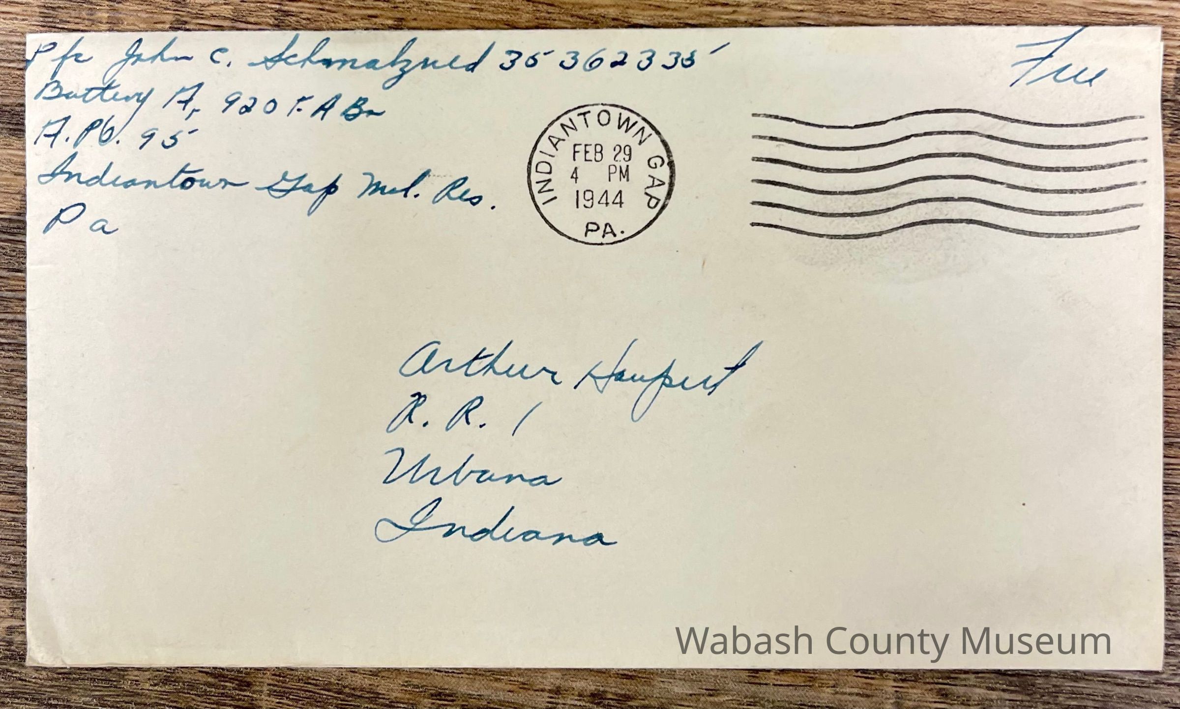Letter - Pfc. John C. Schmalzried (35362335) to Arthur Haupert (Feb. 28, 1944) Envelope is basic white with a return address of: PFC. John C. Schmalzried 35362335 Battery A. 920 FA Bn APO 95 Indiantown Gap Mil. Res. Pa. Addressed to: Arthur Haupert RR1 Urbana Indiana There is no stamp in the top right and it only has Free written in it. Postmark is Indiantown Gap, PA Feb. 29, 1944, 4:00|PM. The letter is one page, with an embossed blue US Army Eagle in the top center with United States Army written underneath. The letter is one page and written on both sides in cursive.
