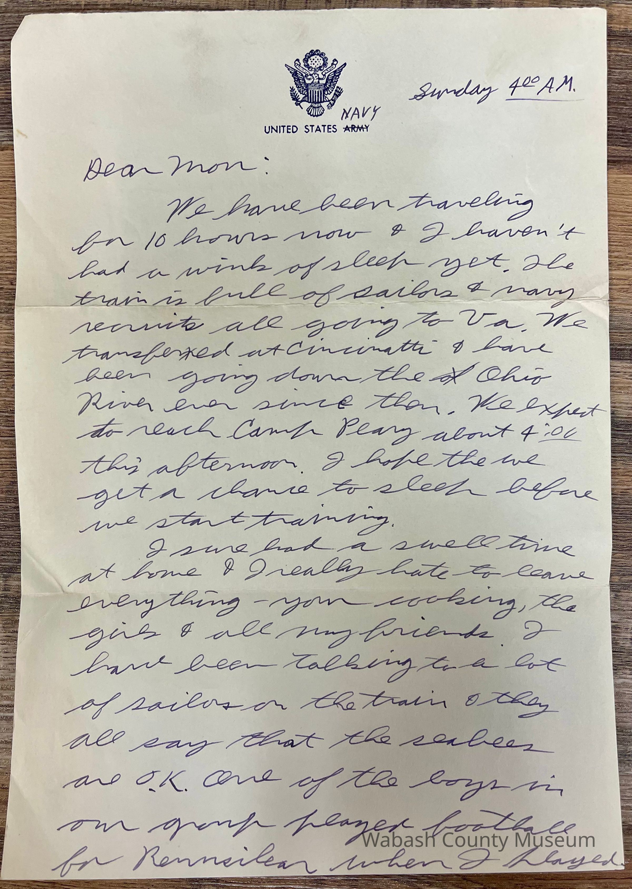 Letter is written on plain white paper. At the top is a blue Eagle holding arrows and a feather in its talons. Underneath the eagle it reads United States Army with the Army crossed out and hand written in it says Navy.