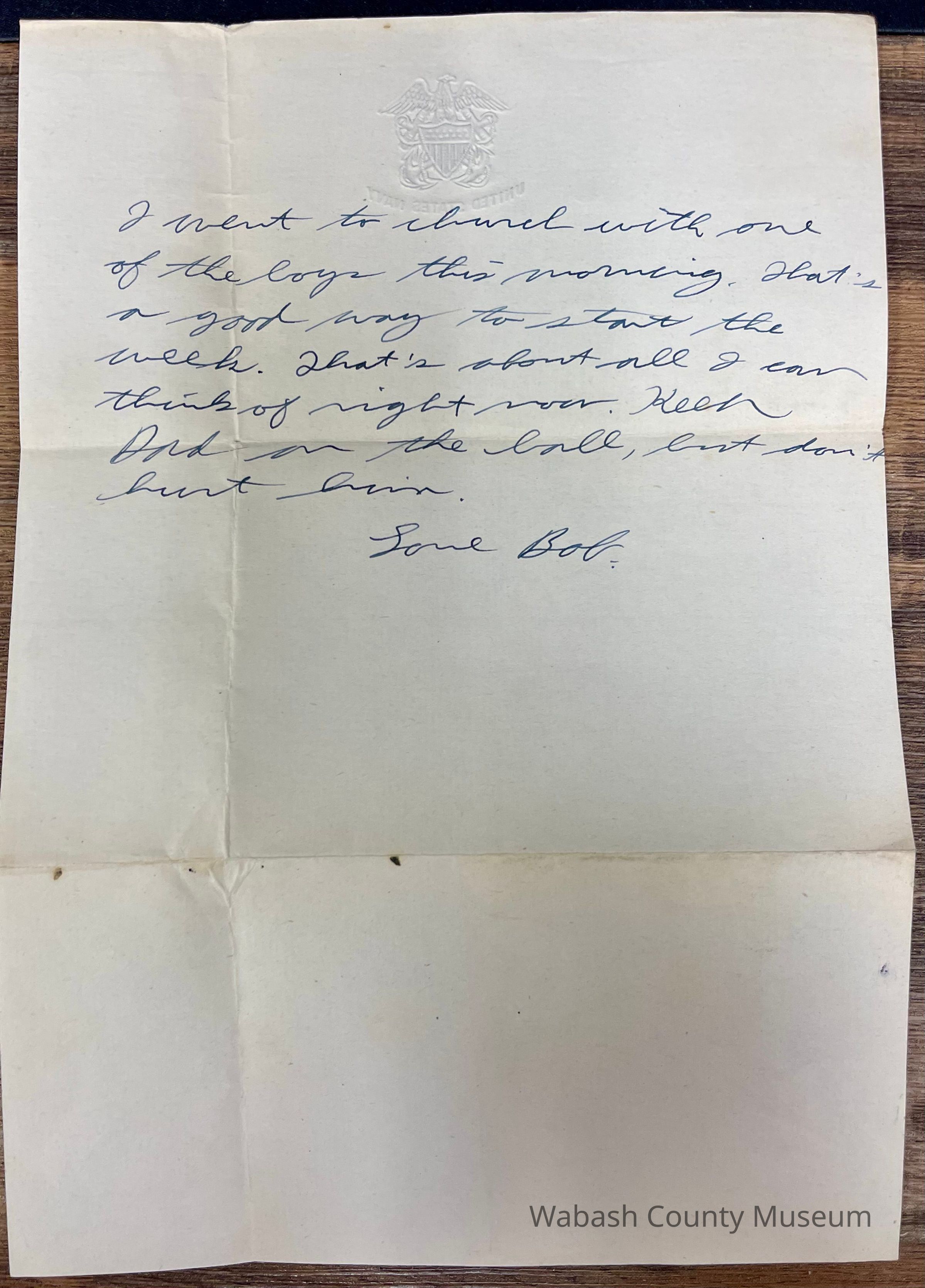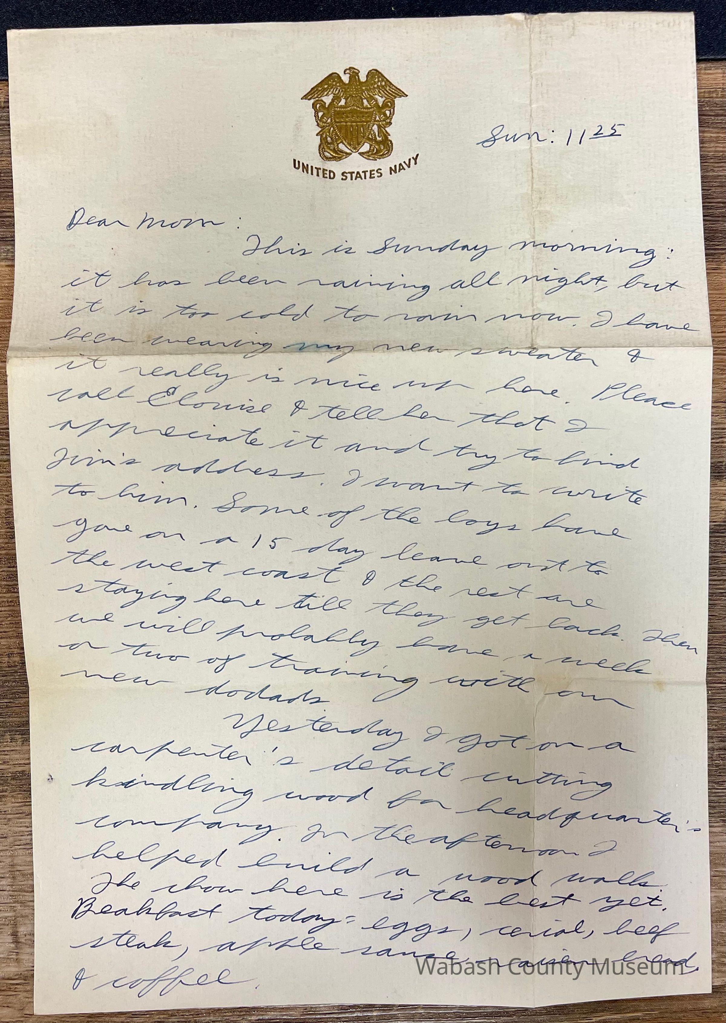 Letter - Robert Milner Bear to Mom, Mrs. John L. Bear (Date Unknown - Sunday 11:25am) Letter is written on plain white paper. At the top is a gold Eagle, shield, and anchors with United States Navy underneath. Paper is hand written and one page in length. Written on both sides.