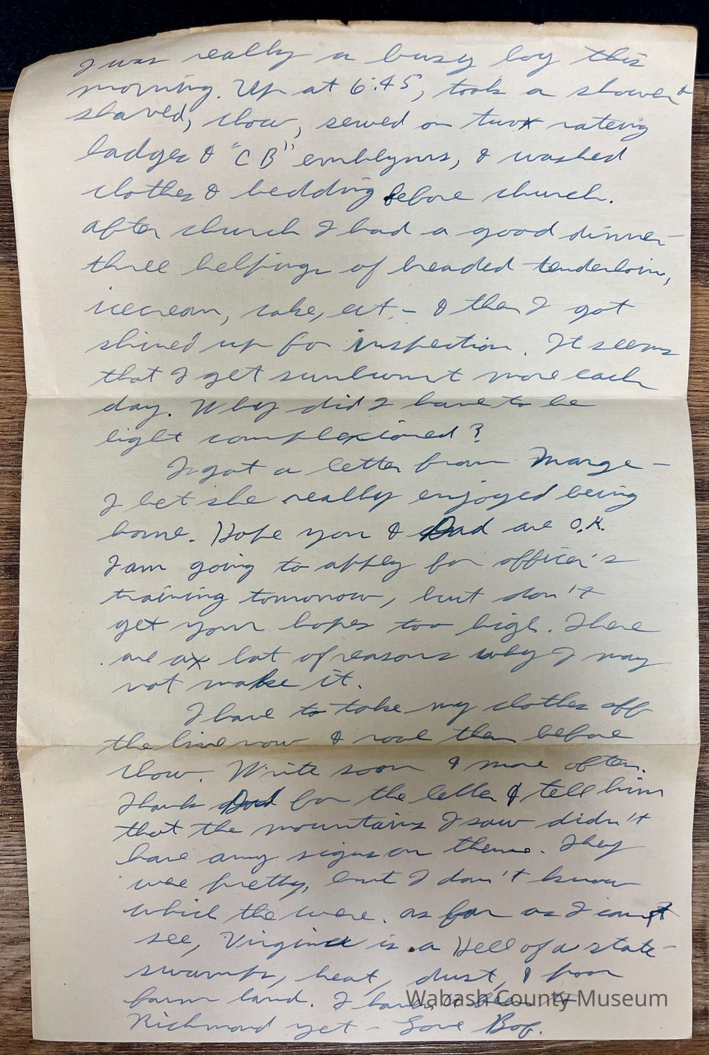 Letter - Robert Milner Bear to Mom, Mrs. John L. Bear (Date Unknown - Sunday 5:00PM) Letter is written on plain white paper. At the top is letterhead showing the emblem of the SeaBees (a flying bumblebee shooting a machine gun). Around the emblem in a circle is a rope and in behind everything are crossed anchors. Underneath it reads U.S. Naval Construction Training Center, Camp Peary, Williamsburg, Virginia Paper is hand written and one page in length. Written on both sides.