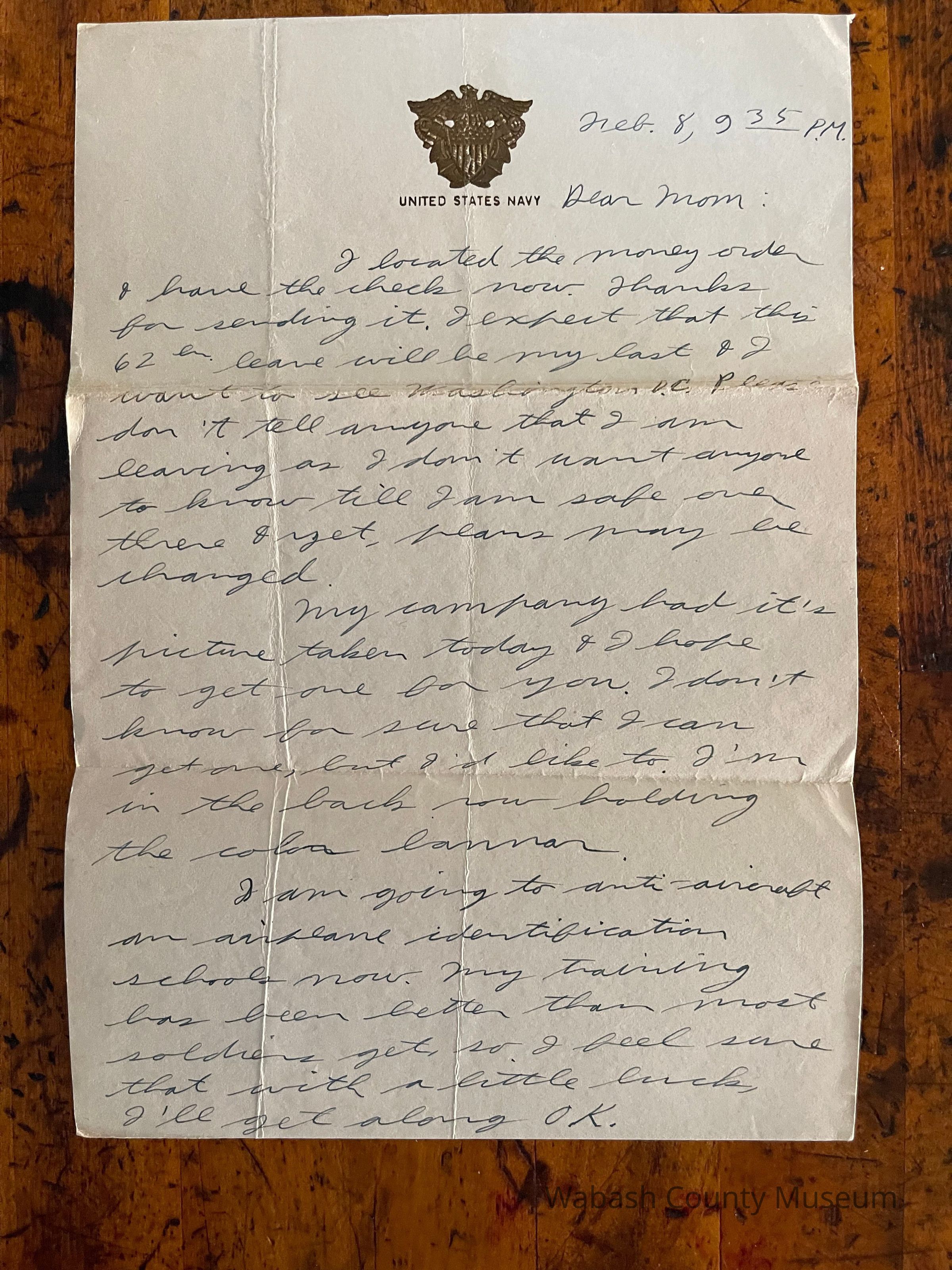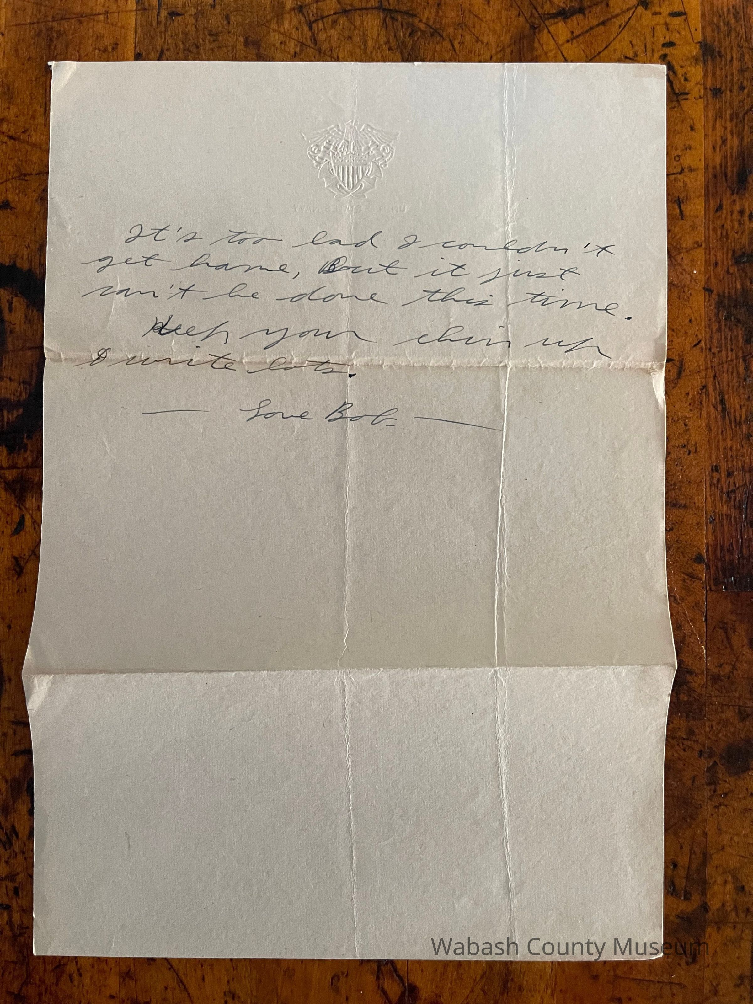 Letter is written on lightweight stationary with a gold eagle and shield. Under the eagle it reads: United States Navy