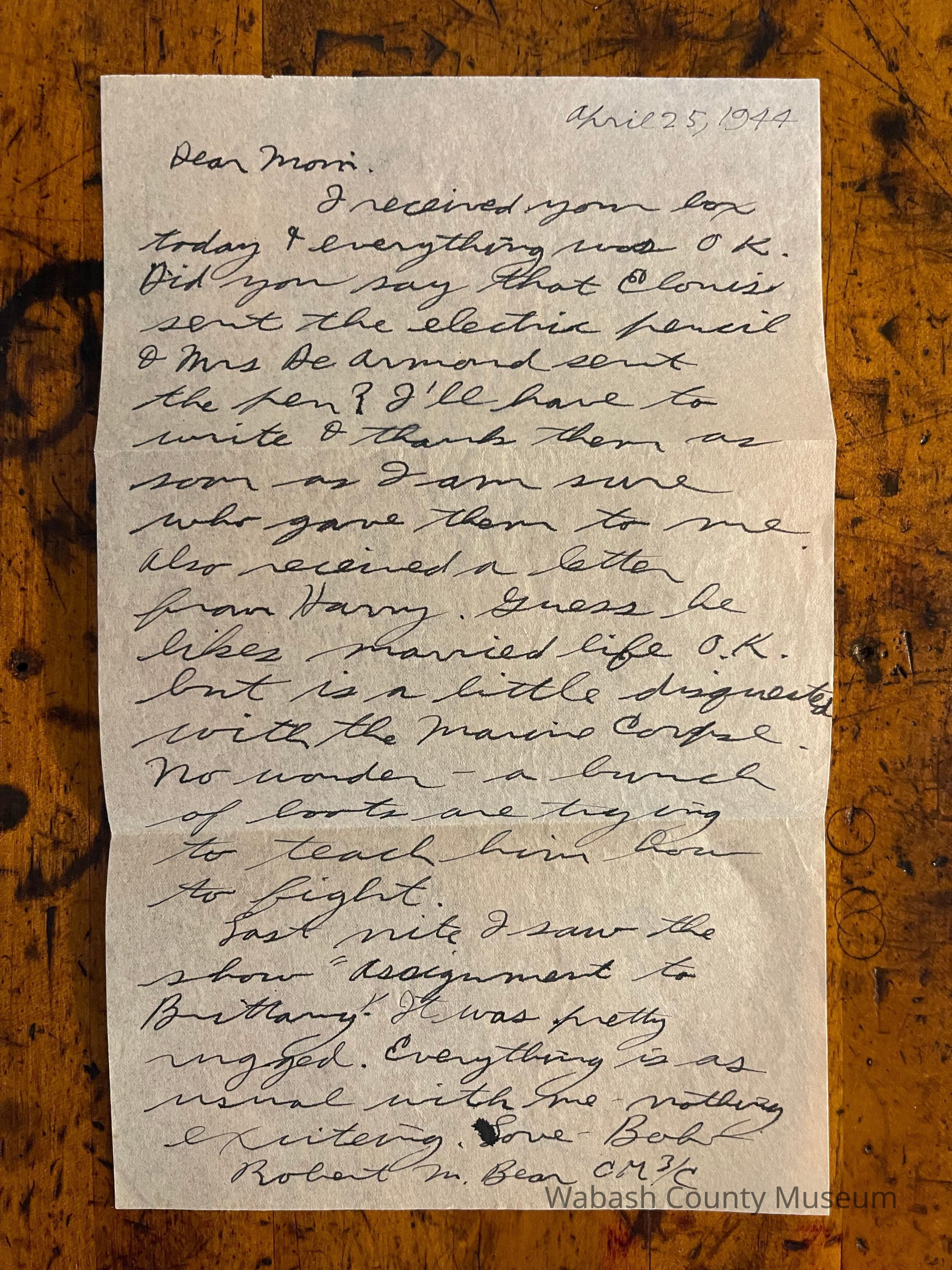 Letter - Robert Milner Bear to Mom, Mrs. John L. Bear (Postmarked Apr. 26, 1944)Entry/Object ID