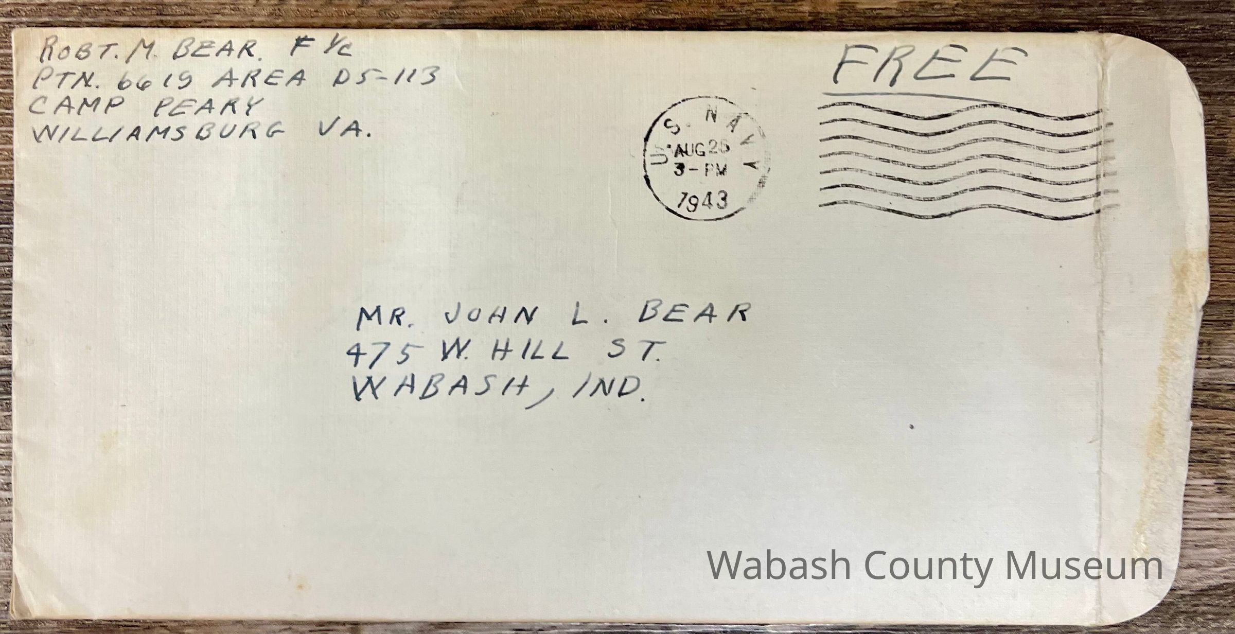 Letter - Robert Milner Bear to Mom, Mrs. John L. Bear (Postmarked Aug 25, 1943 | 3-PM)Entry/Object ID
