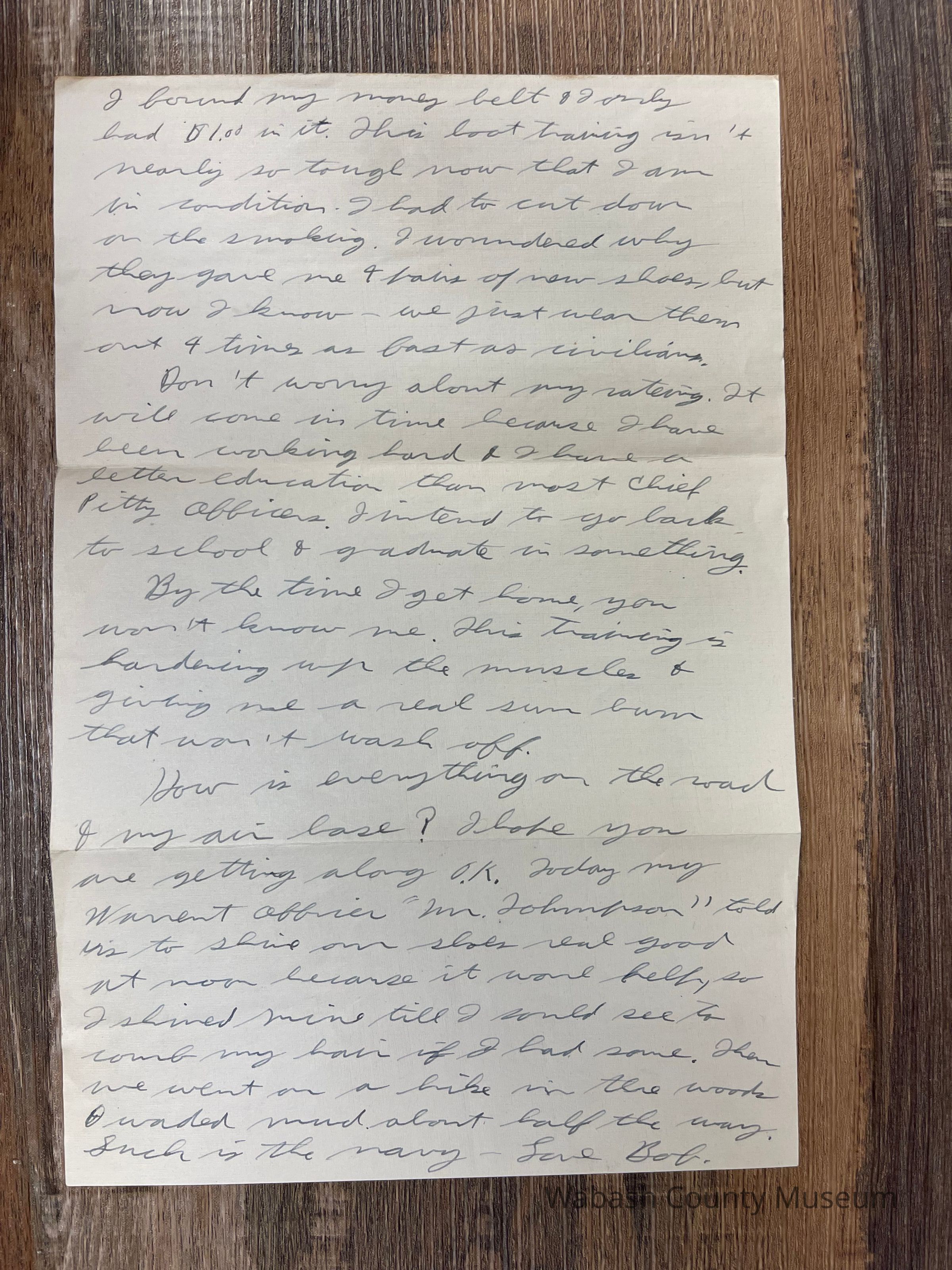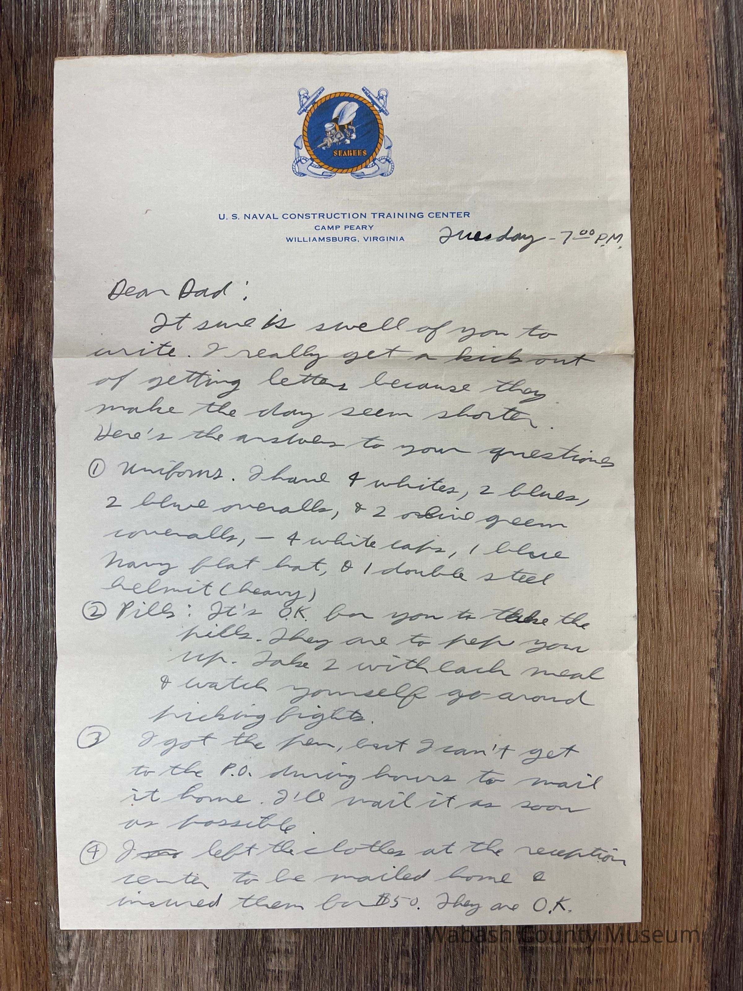 Letter is written on plain white paper. At the top is letterhead showing the emblem of the SeaBees (a flying bumblebee shooting a machine gun). Around the emblem in a circle is a rope and in behind everything are crossed anchors. Underneath it reads U.S. Naval Construction Training Center, Camp Peary, Williamsburg, Virginia