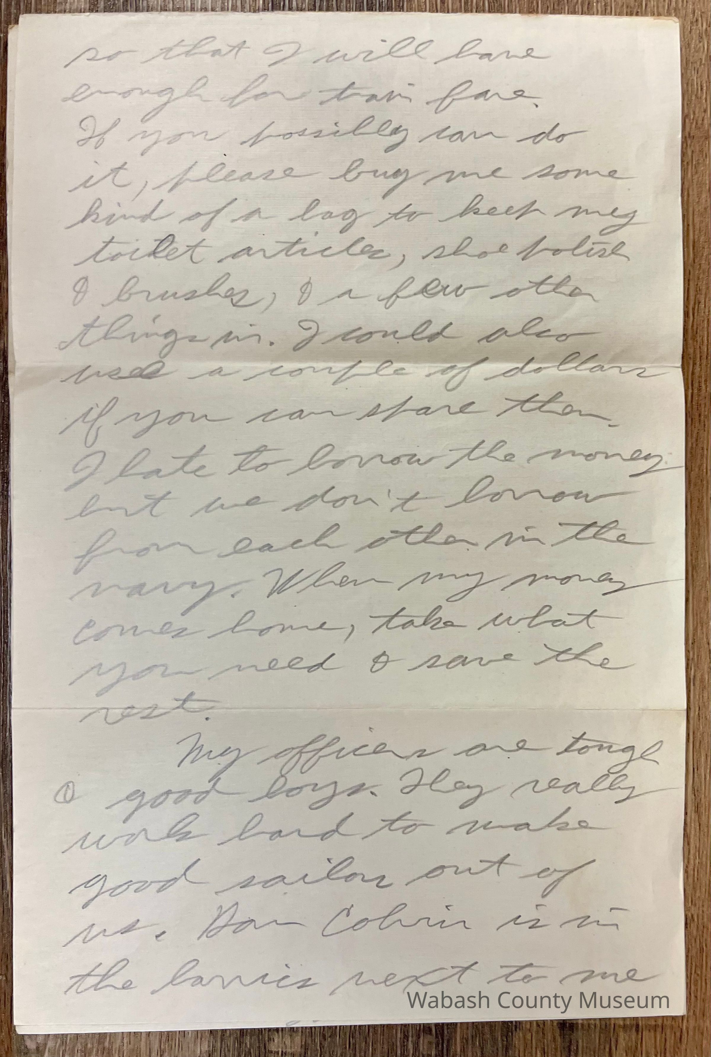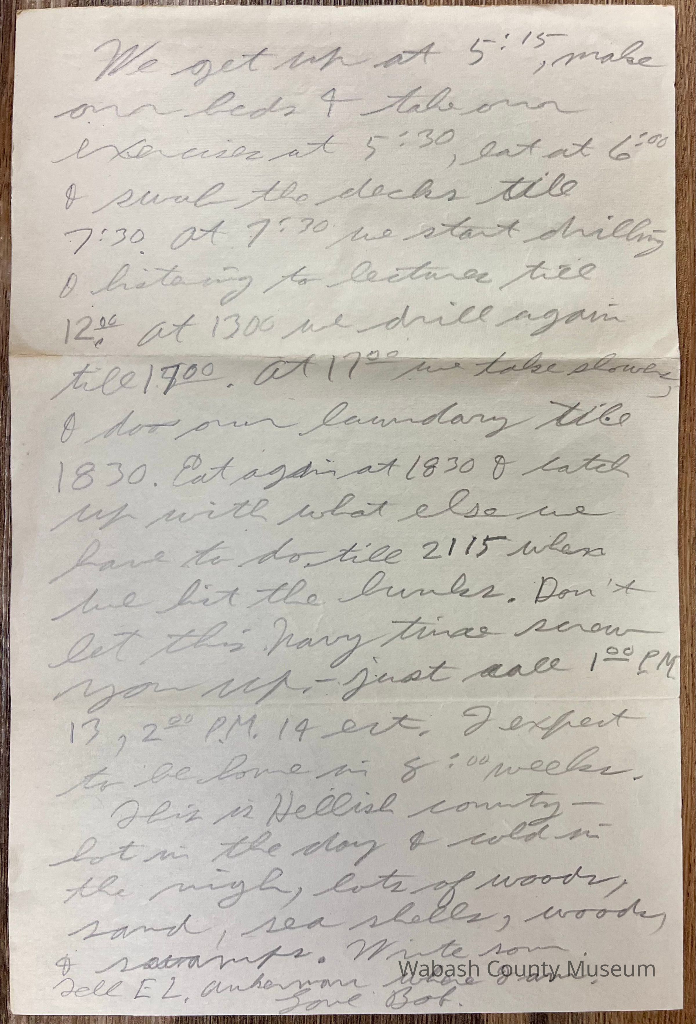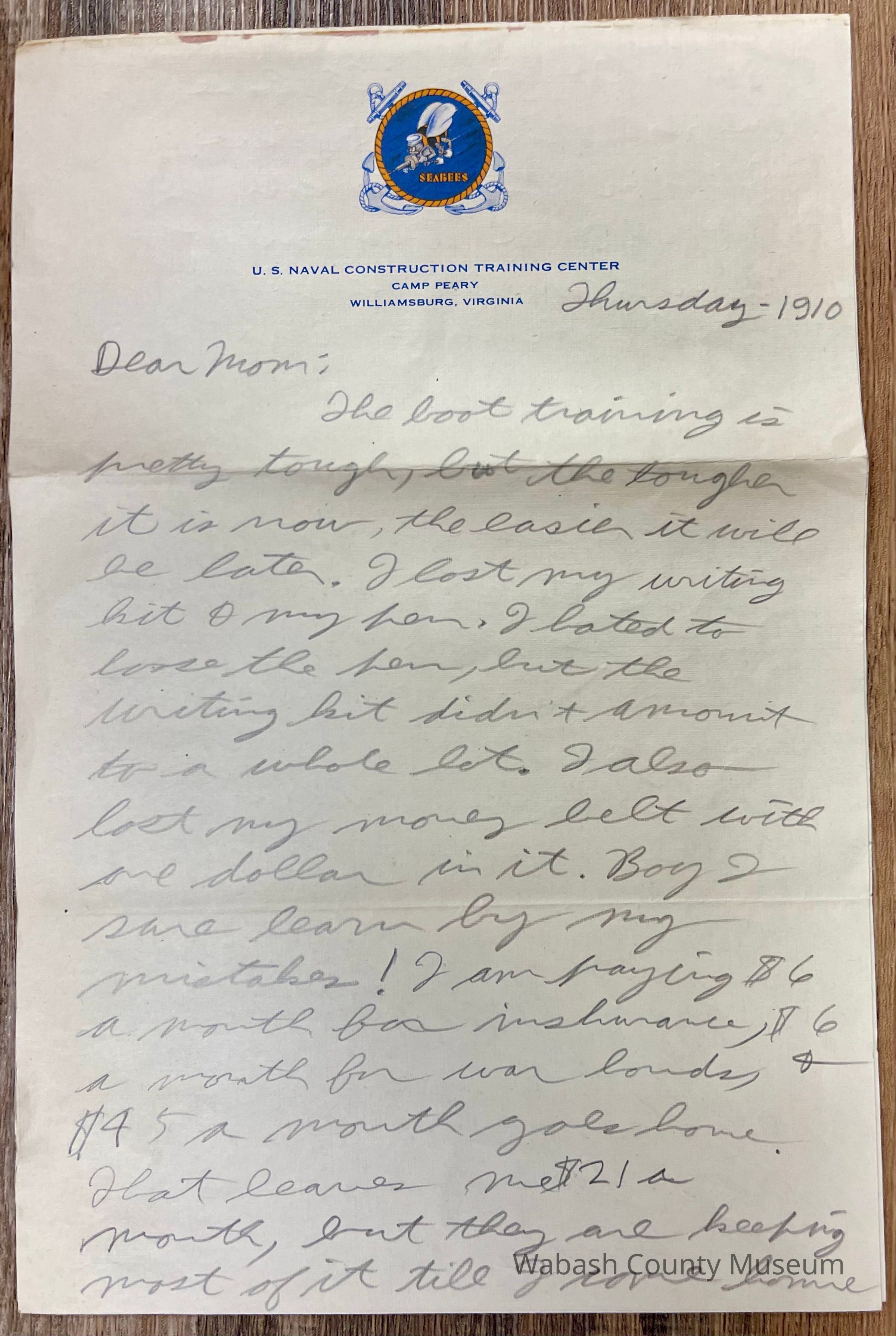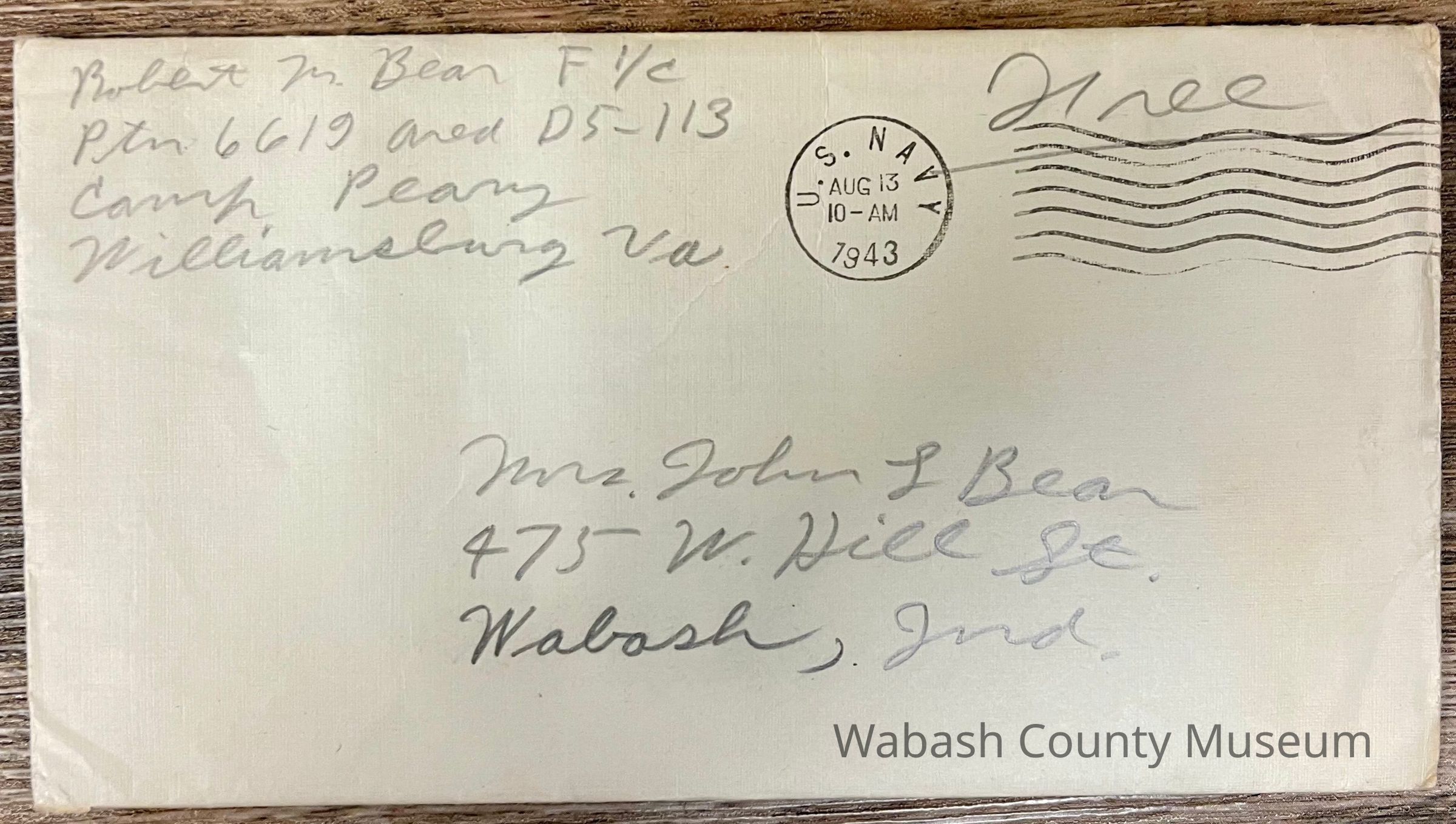 Letter - Robert Milner Bear to Mom, Mrs. John L. Bear (Postmarked Aug. 13, 1943 | 10:00AM) Postmark on envelope reads: US Navy, Aug. 13, 1943 | 10:00AM There is no stamp but envelope does have postmark waves. Above them is hand written Free in Pencil. Return address on envelope is: Robert M. Bear F1/c Ptn 6619 Area D5-113 Camp Peary Williamsburg, Va Send to address is: Mrs. John L. Bear 475 W. Hill St. Wabash, Ind Letter is written on plain white paper with a blue eagle holding arrows and a palm leaf in its talons. Underneath it reads United States Army. It is hand written, unlined and two pages in length that are written on both sides.