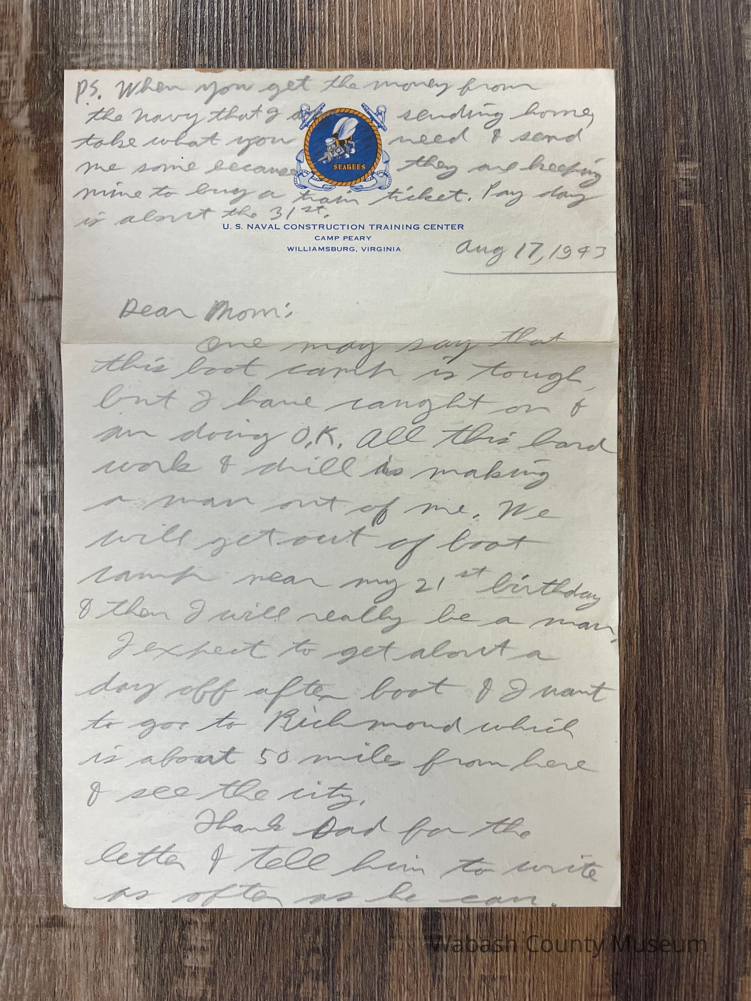 Letter is written on plain white paper. At the top is letterhead showing the emblem of the SeaBees (a flying bumblebee shooting a machine gun). Around the emblem in a circle is a rope and in behind everything are crossed anchors. Underneath it reads U.S. Naval Construction Training Center, Camp Peary, Williamsburg, Virginia