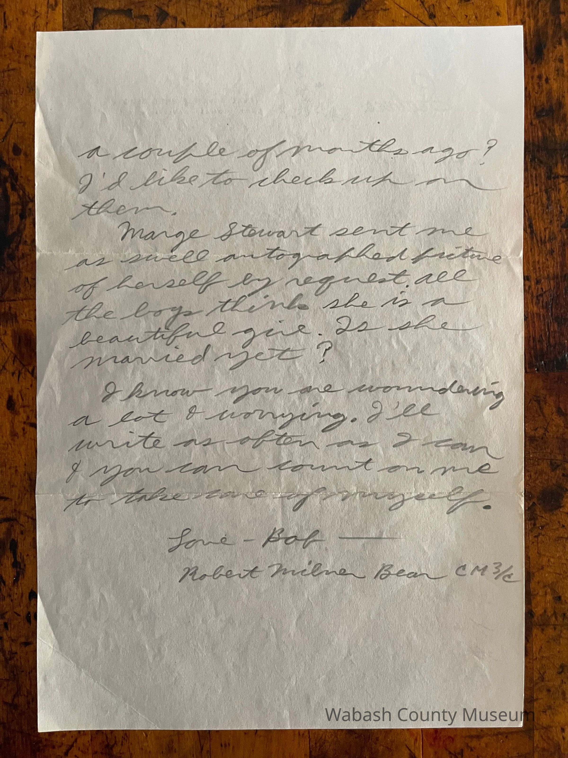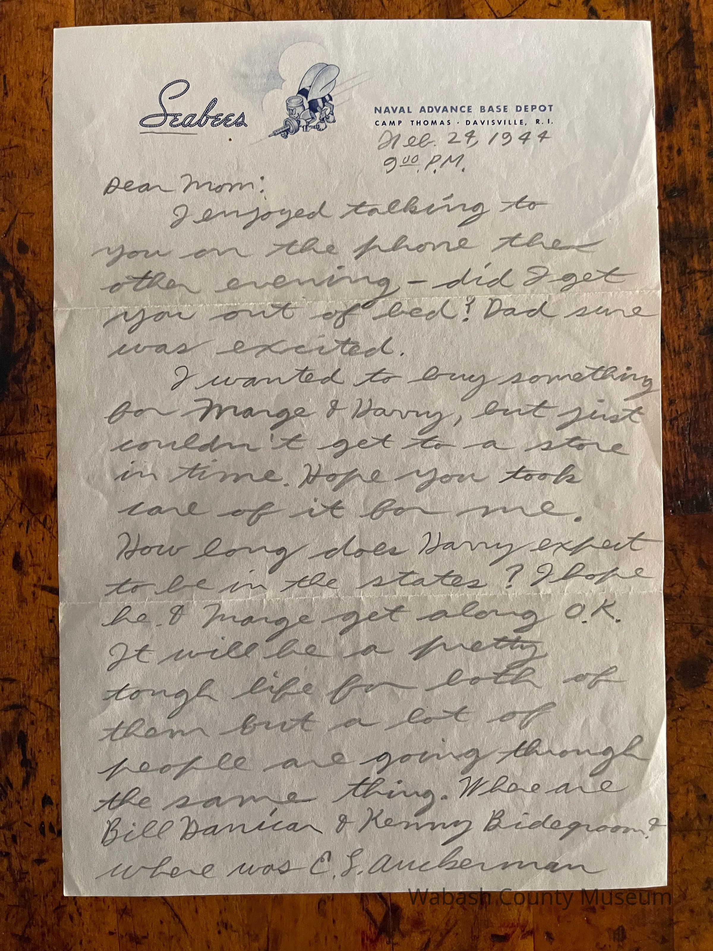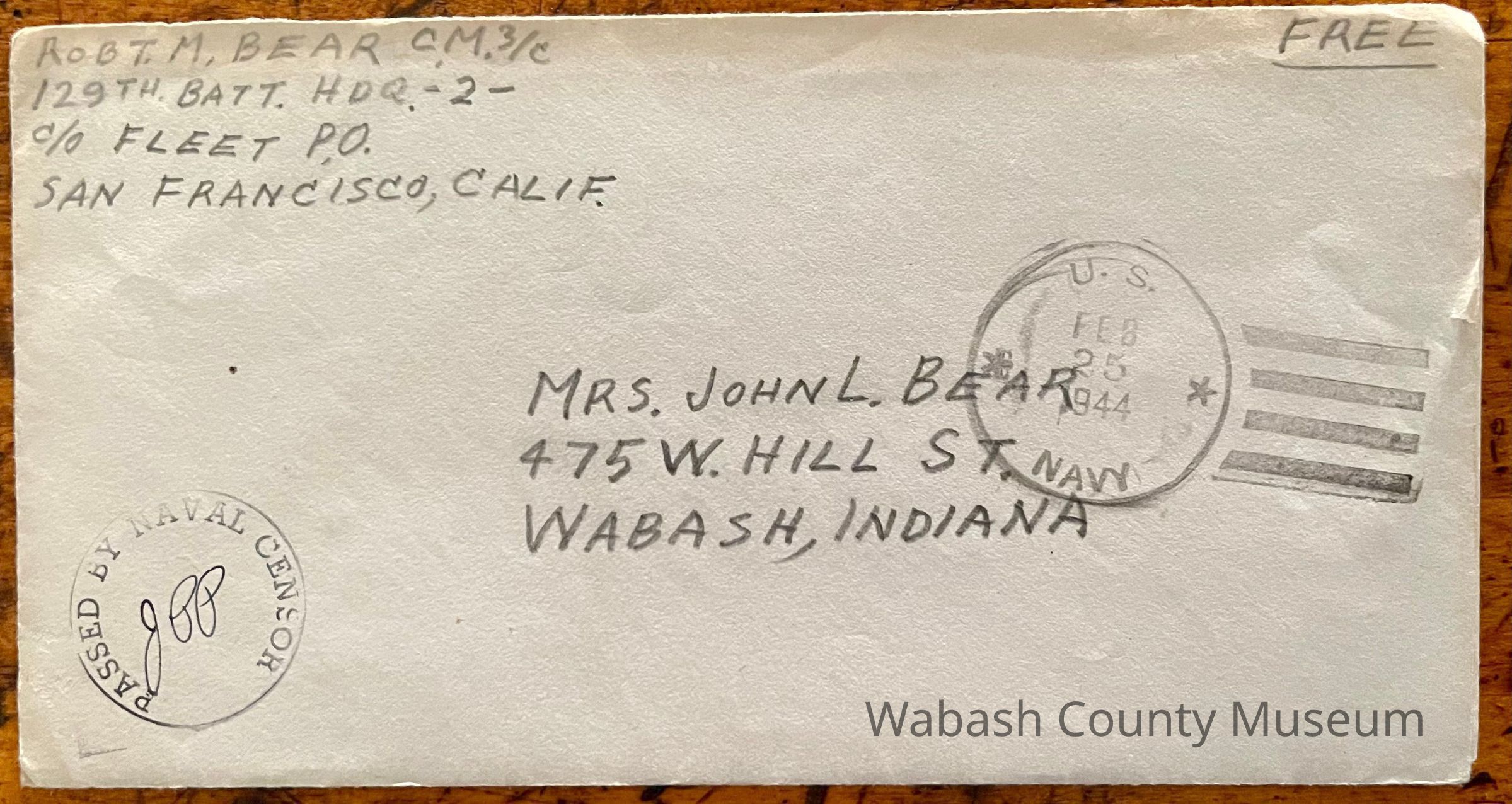 Letter - Robert Milner Bear to Mom, Mrs. John L. Bear (Postmarked Feb.25, 1944) Postmark on envelope reads: US Navy, Feb. 25, 1944 No stamp on envelope but "FREE" is written where the stamp is to be located. In lower left corner of envelope is a circle ink stamp reading: Passed by Naval Censor with the censor's initials inside the ink stamp circle. Letter is written on lightweight stationary. At the top of the stationary on the left side is "Seabees. Next to this to the right is the Seabee mascot (the flying Bumblebee with machine gun, hammer and wrench) and finally on the right it reads: Naval Advance Base Depot Camp Thomas Davisville, R.I. It is hand written, unlined and one page in length and written on both sides