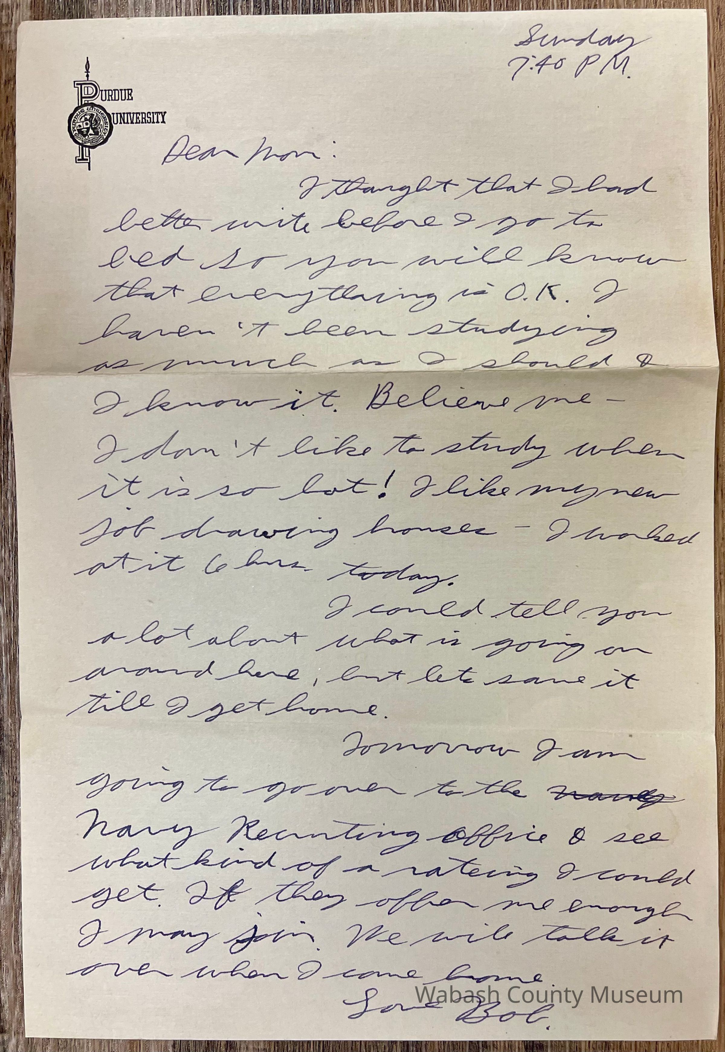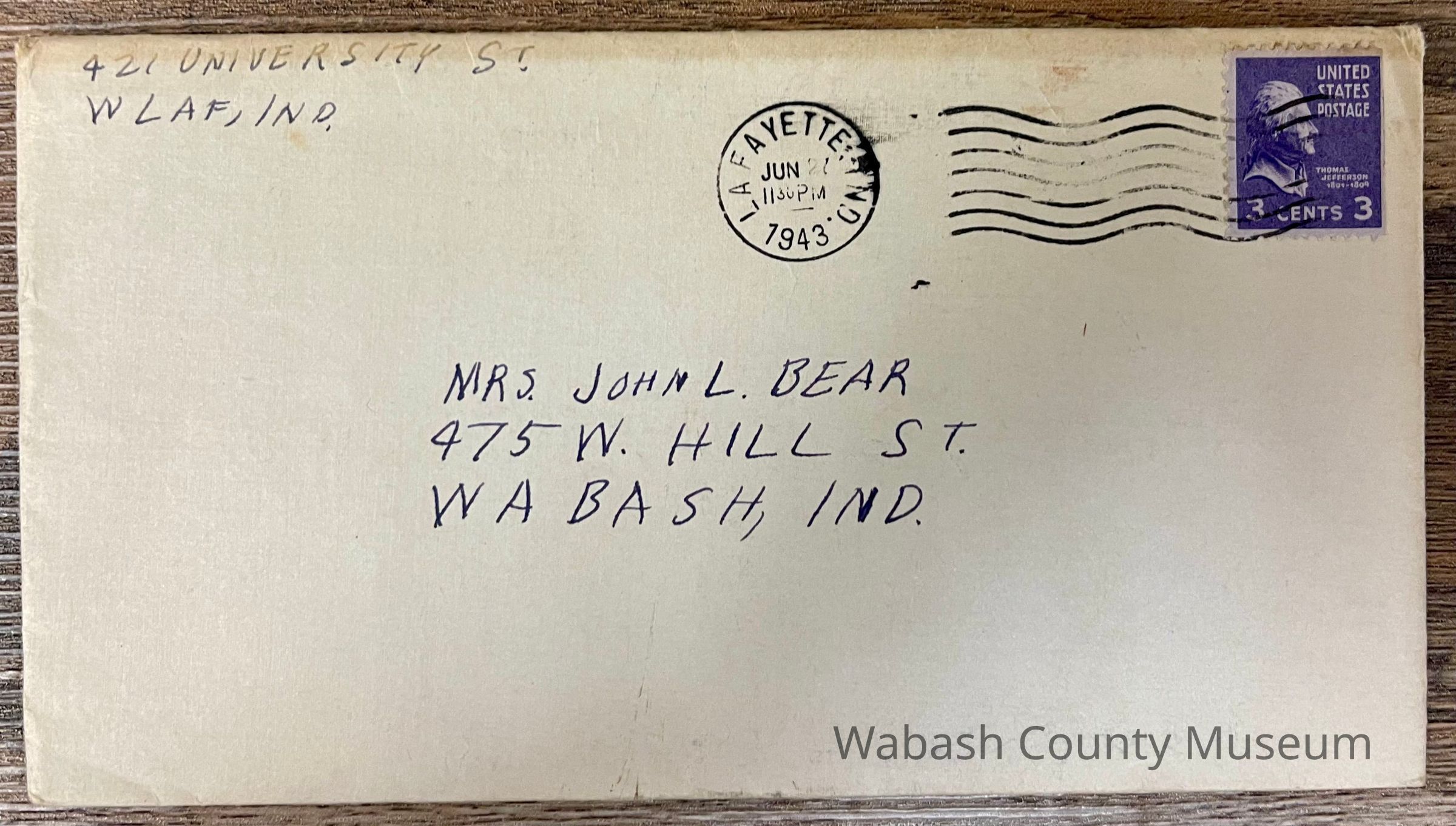 Letter - Robert Milner Bear to Mom, Mrs. John L. Bear (Postmarked Jun. 27, 1943 | 11:30PM) Postmark on envelope reads: Lafayette, IND. Jun. 27, 1943 | 11:30PM Purple 3¢ Thomas Jefferson stamp showing his profile and labeled in the top right corner: United States Postage. Below that it reads: Thomas Jefferson 1801-1804. In the center bottom it reads: Cents with the number 3 on either side. On the back of the envelope it reads Purdue University with the Purdue seal over the top of the letters. Letter is written on plain white paper with a Purdue seal over the top of the letters Purdue University. It is hand written, unlined and one page in length and written on both sides.