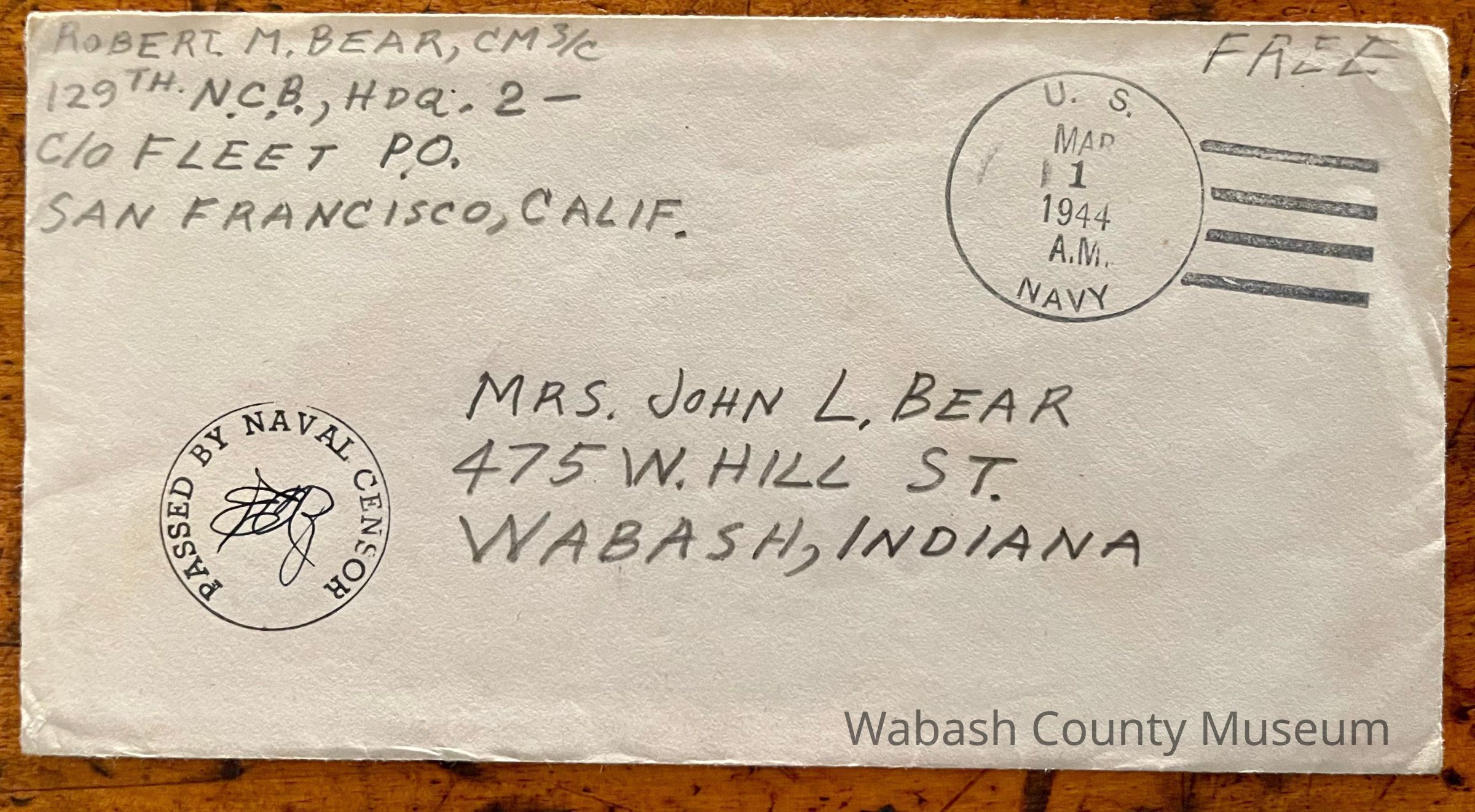 Postmark on envelope reads: US Navy, Mar. 1, 1944