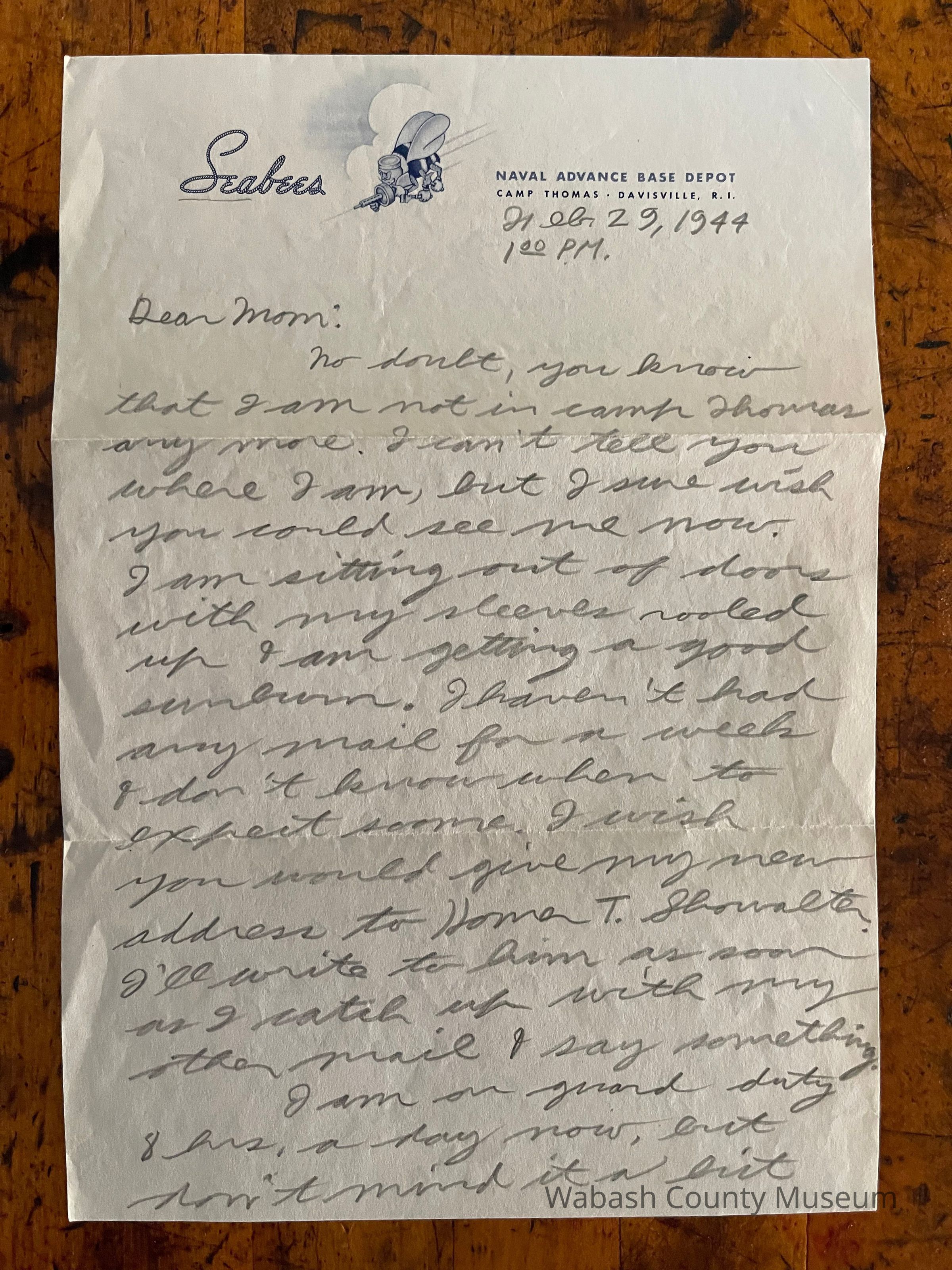 Letter is written on lightweight stationary. At the top of the stationary on the left side is "Seabees. Next to this to the right is the Seabee mascot (the flying Bumblebee with machine gun, hammer and wrench) and finally on the right it reads: