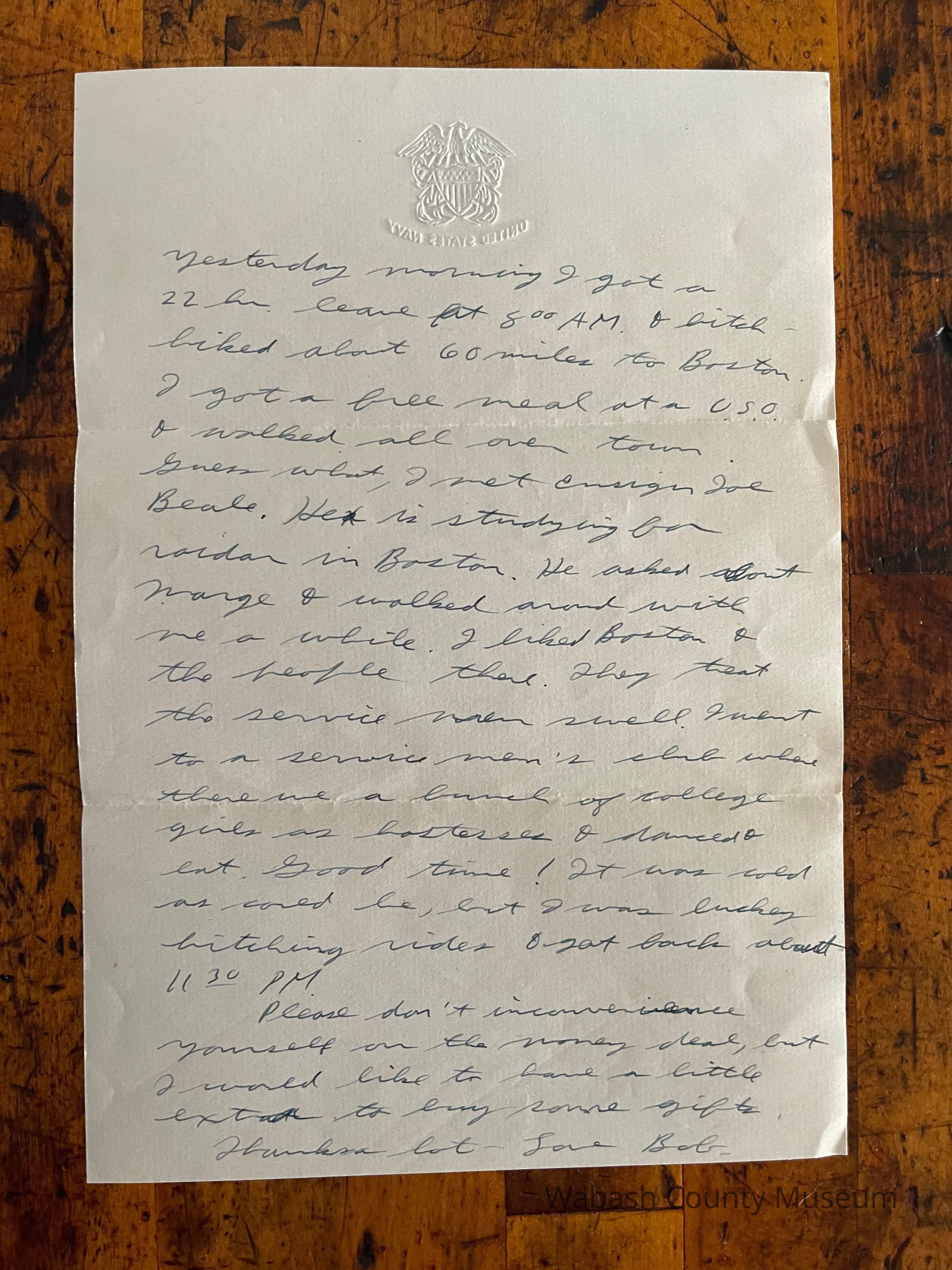 Letter is written on plain white paper with a golden eagle an shield with crossed anchors. Underneath it reads United States Navy. It is hand written, unlined and one page in length and written on both sides.