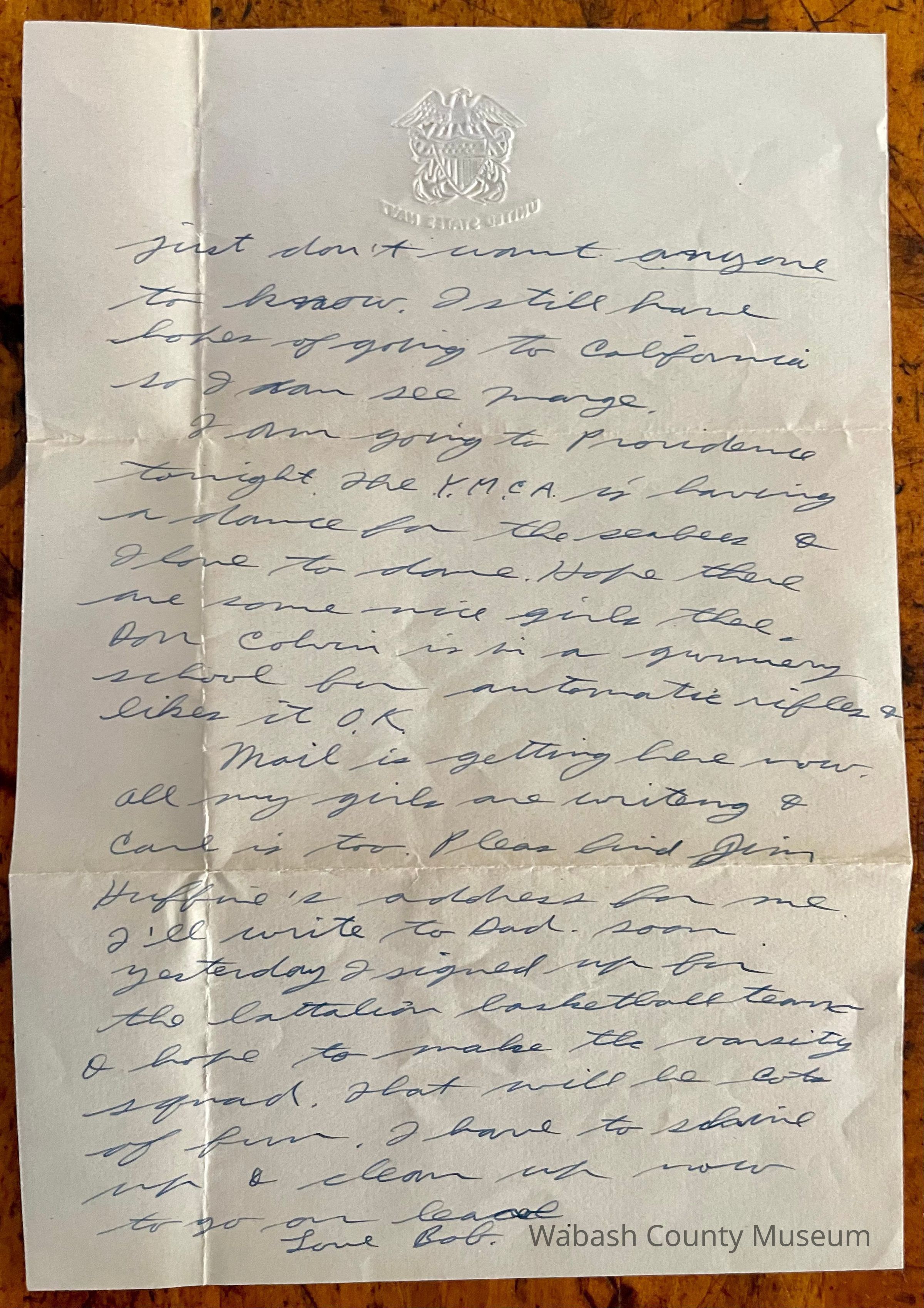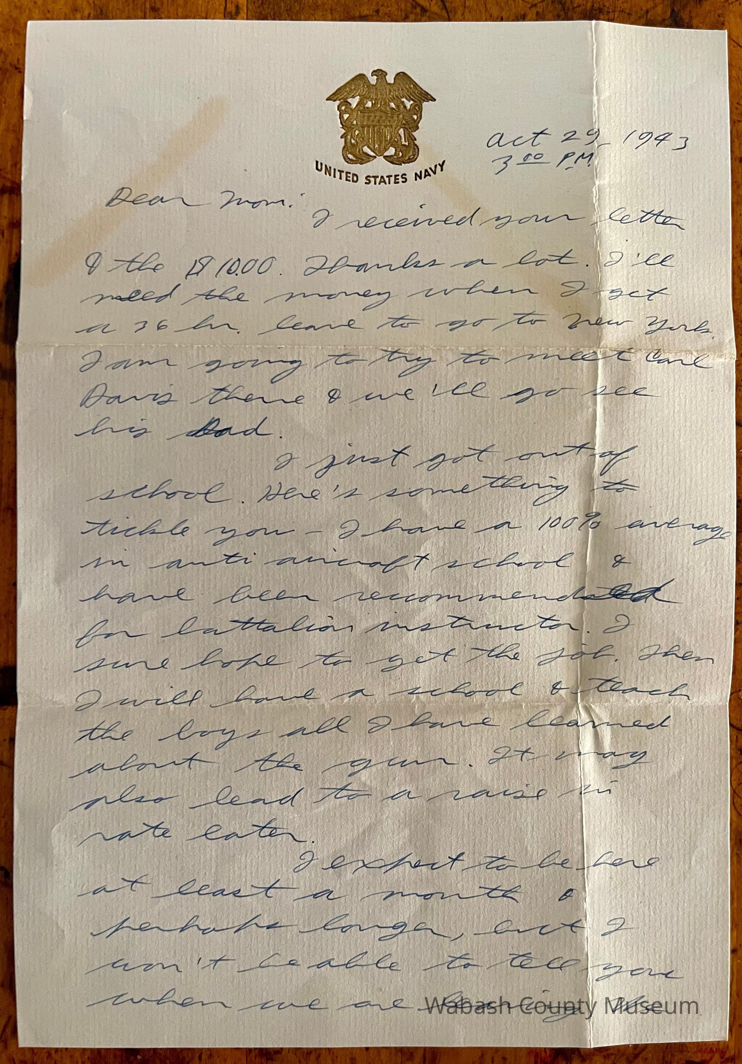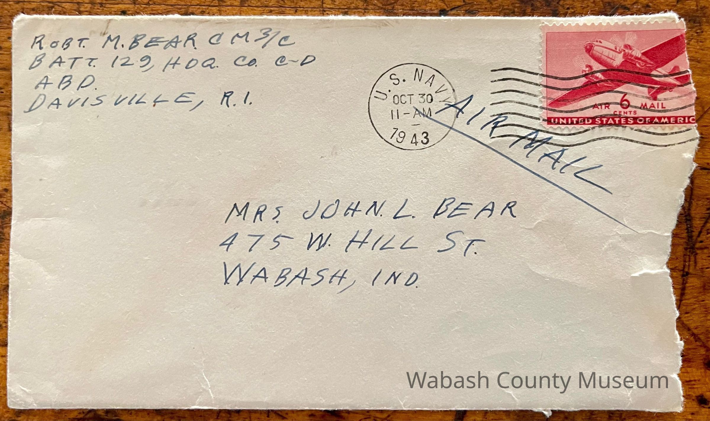 Letter - Robert Milner Bear to Mom, Mrs. John L. Bear (Postmarked Oct. 30, 1943 | 11:00AM) Postmark on envelope reads: US Navy, Oct. 30, 1943 | 11:00AM Red 6¢ Air Mail stamp in the top right with approx. 1/4 torn off when the envelope was opened on the side. Picture on the stamp is of a DC3 in flight from in front and below showing part of this front and underside. Across the bottom of the stamp it reads: United States Postage. Right above that is Air 6¢ Mail with cents written below the number six. The word "Airmail" is written diagonally across the bottom left corner of the stamp. Letter is written on plain white paper with a golden eagle an shield with crossed anchors. Underneath it reads United States Navy. It is hand written, unlined and one page in length and written on both sides.