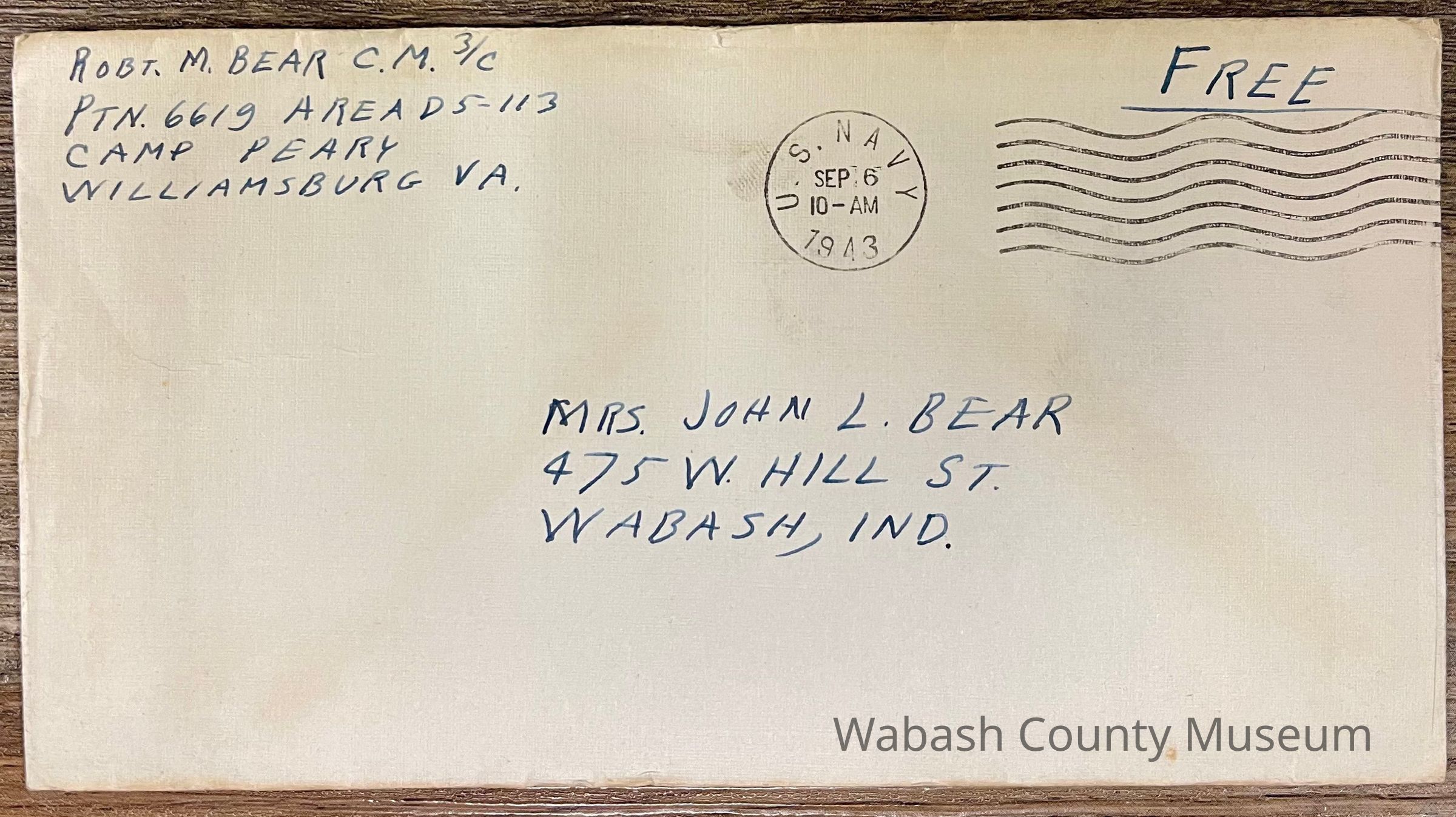 Letter - Robert Milner Bear to Mom, Mrs. John L. Bear (Sep 6, 1943 - Tuesday 3:35PM)Entry/Object ID