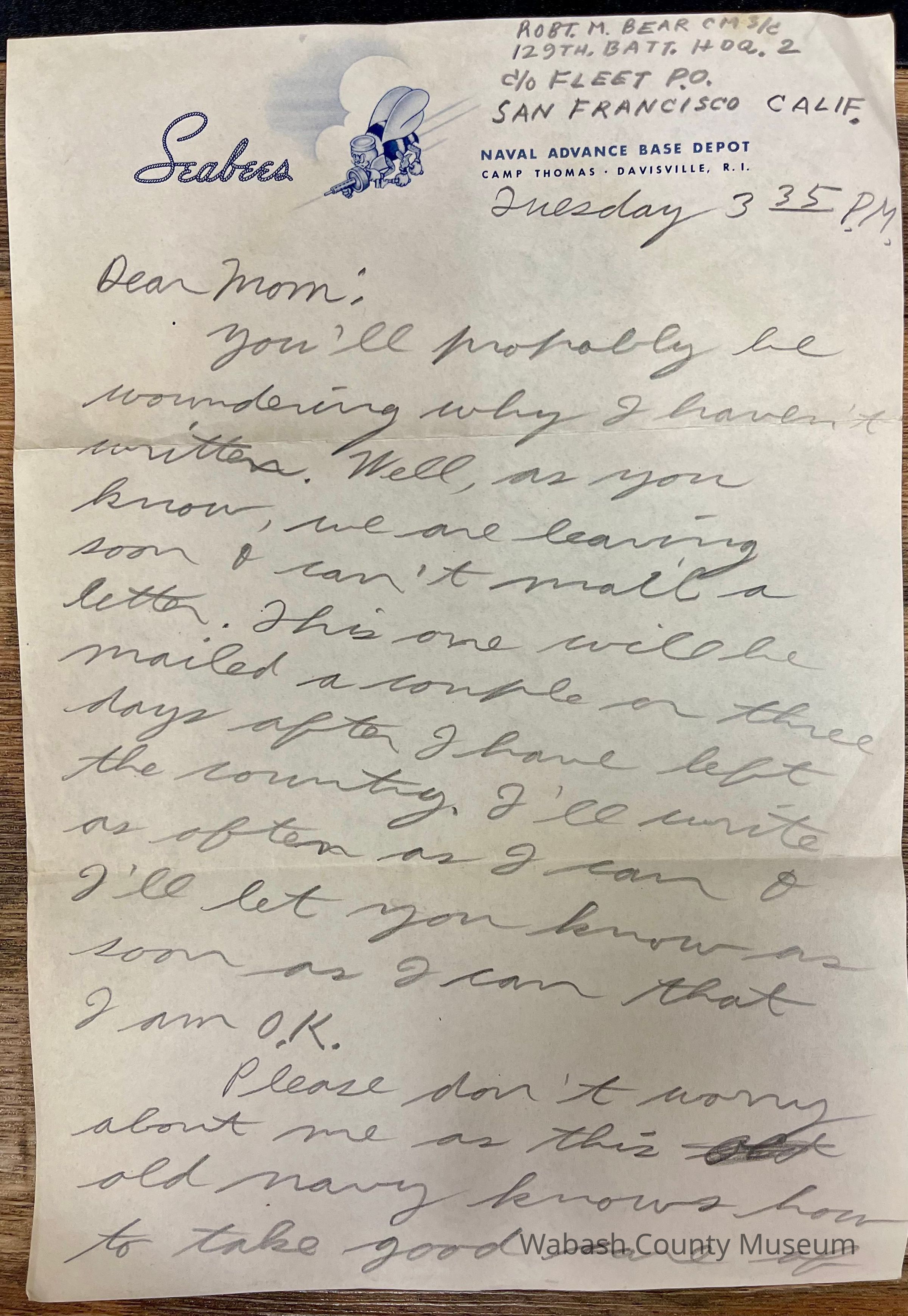 Letter - Robert Milner Bear to Mom, Mrs. John L. Bear (Sep 6, 1943 - Tuesday 3:35PM)