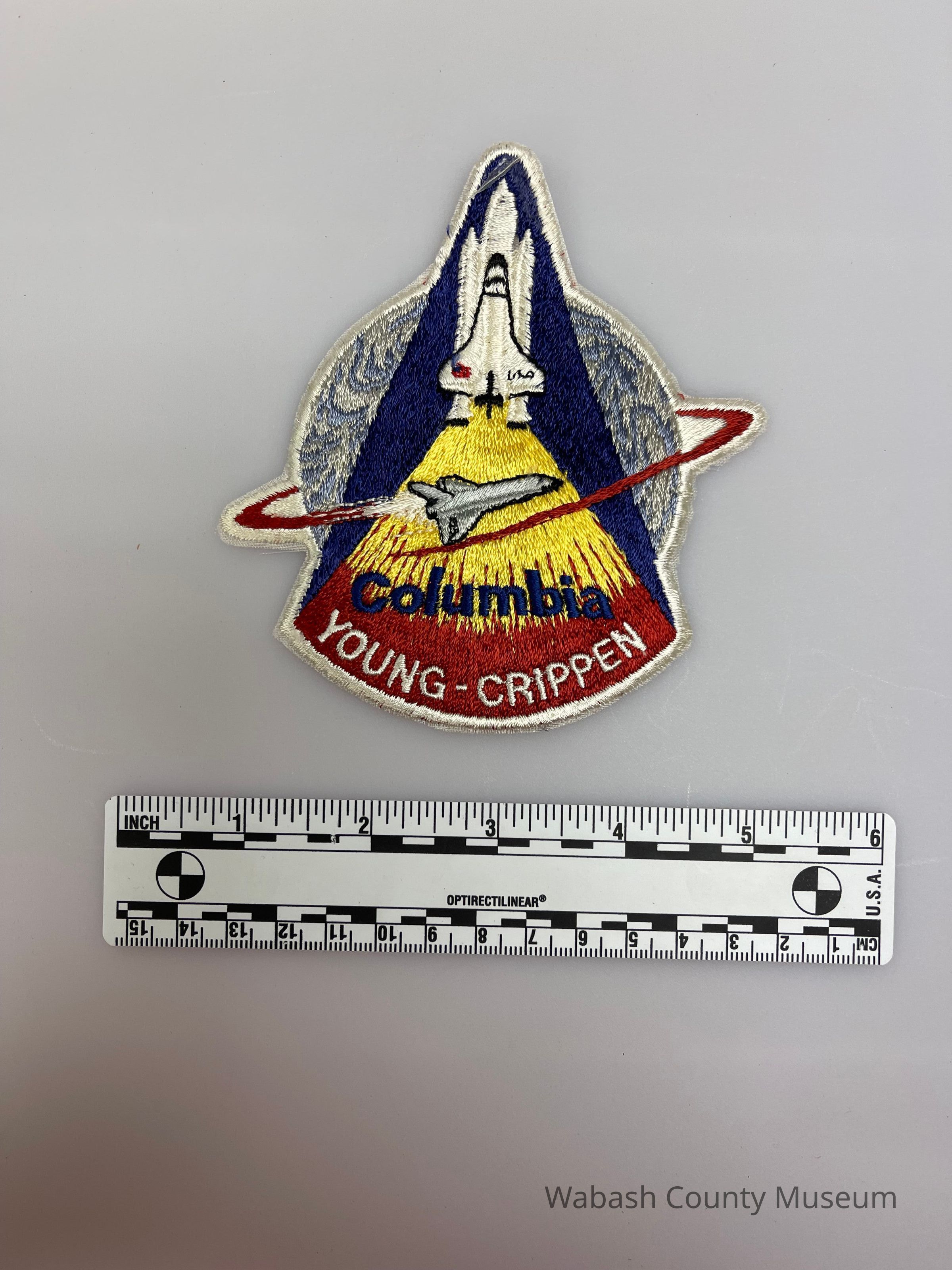 NASA Mission Patch - STS 1 (Young, Crippen) 1st Space Shuttle Mission, 1st Flight of Columbia Crew: John W. Young, Commander; Robert L. Crippen, Pilot; Major systems were tested successfully on the first test flight of a Space Shuttle. However, Columbia experienced tile damage at launch due to an overpressure wave created by the ignition of the twin solid rocket boosters.