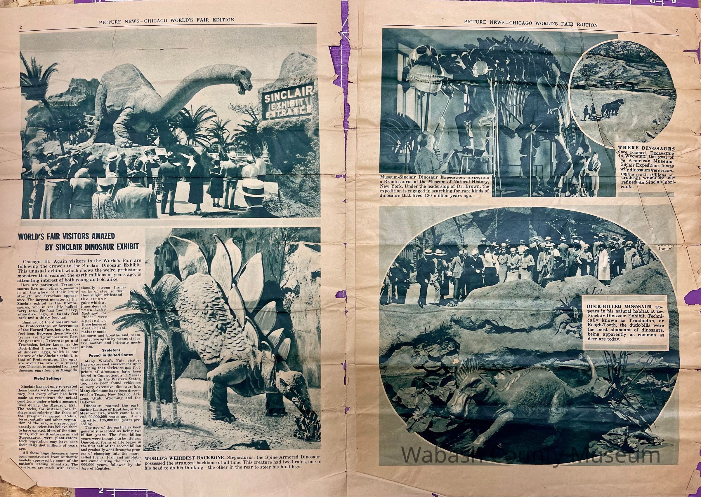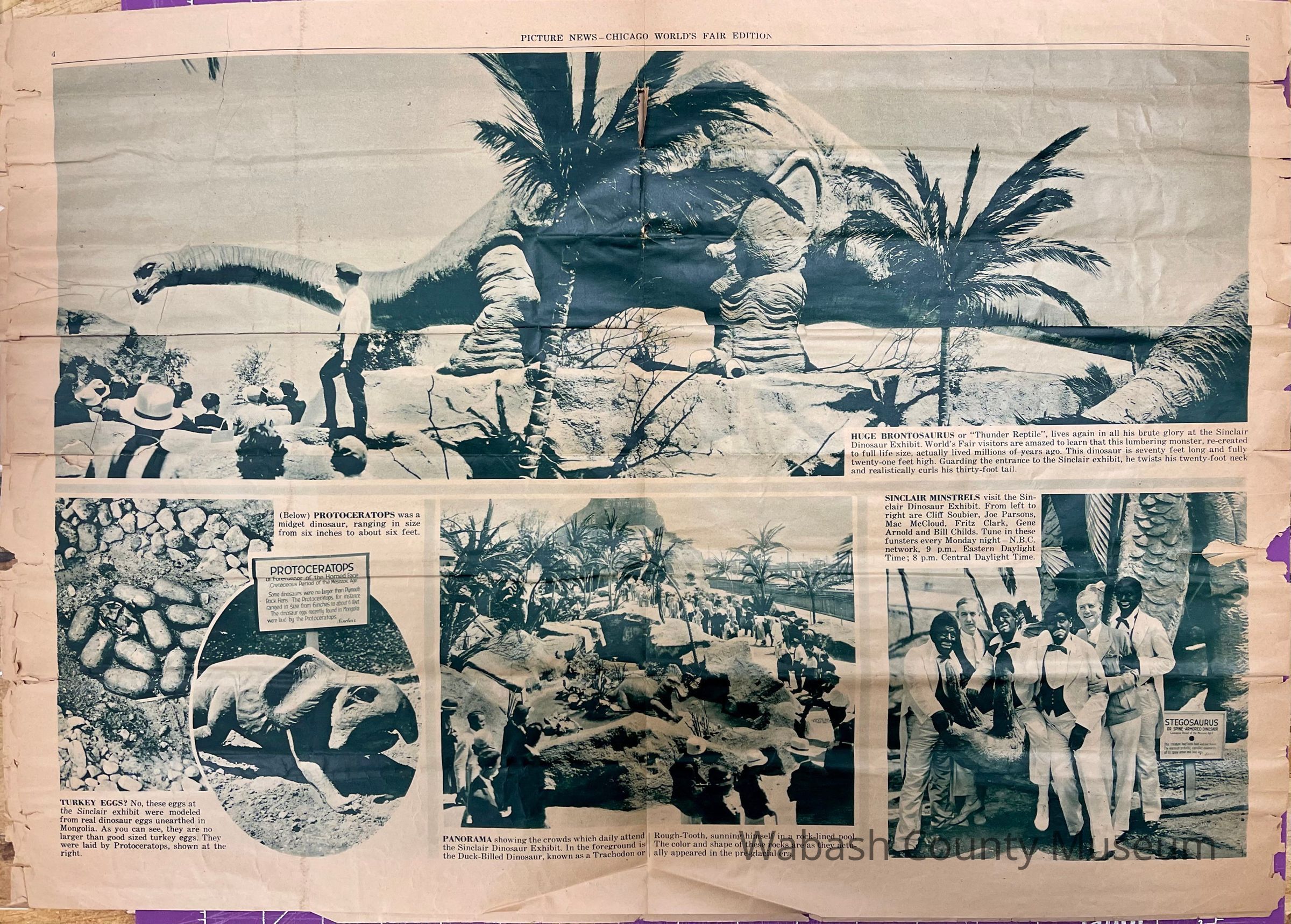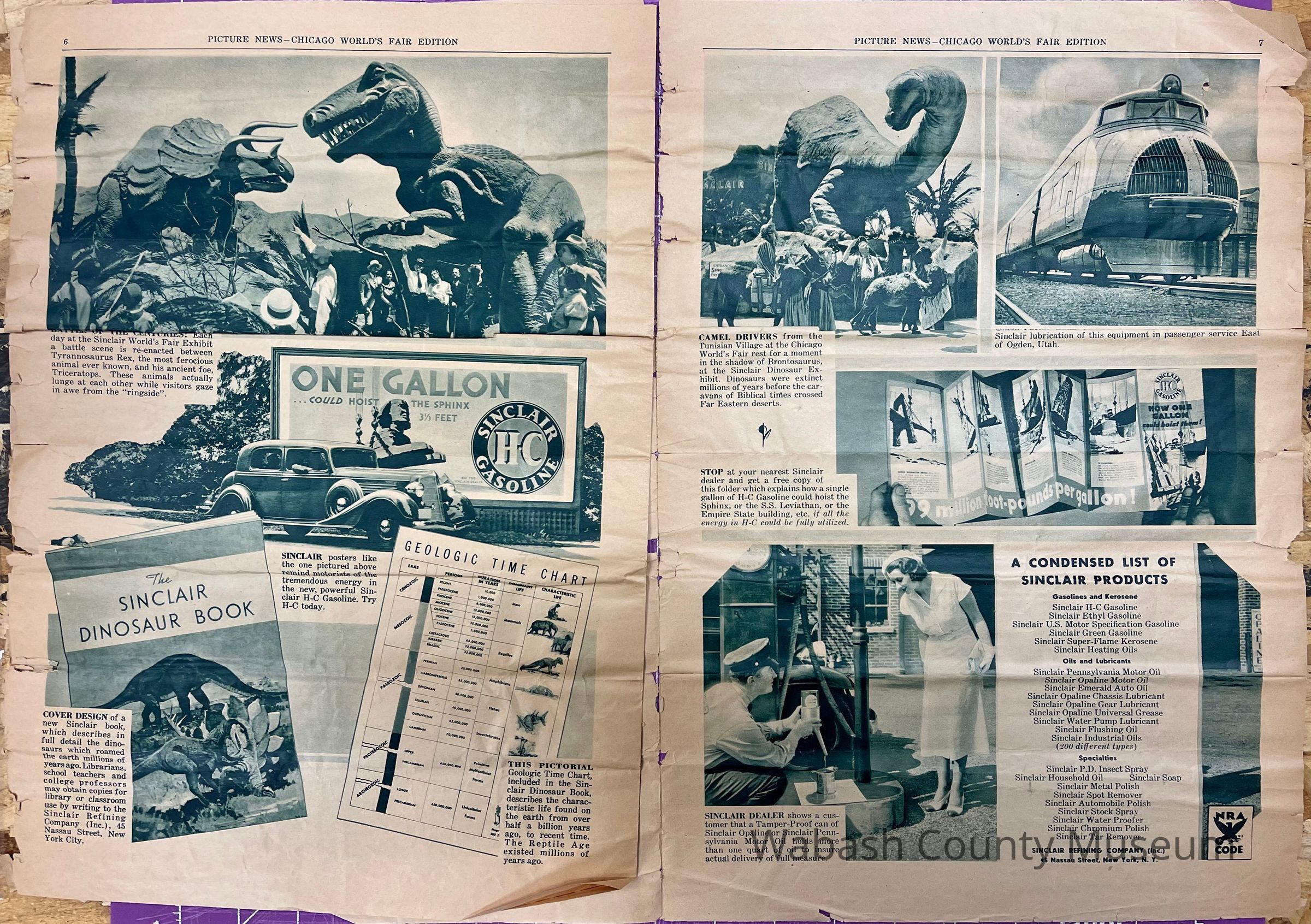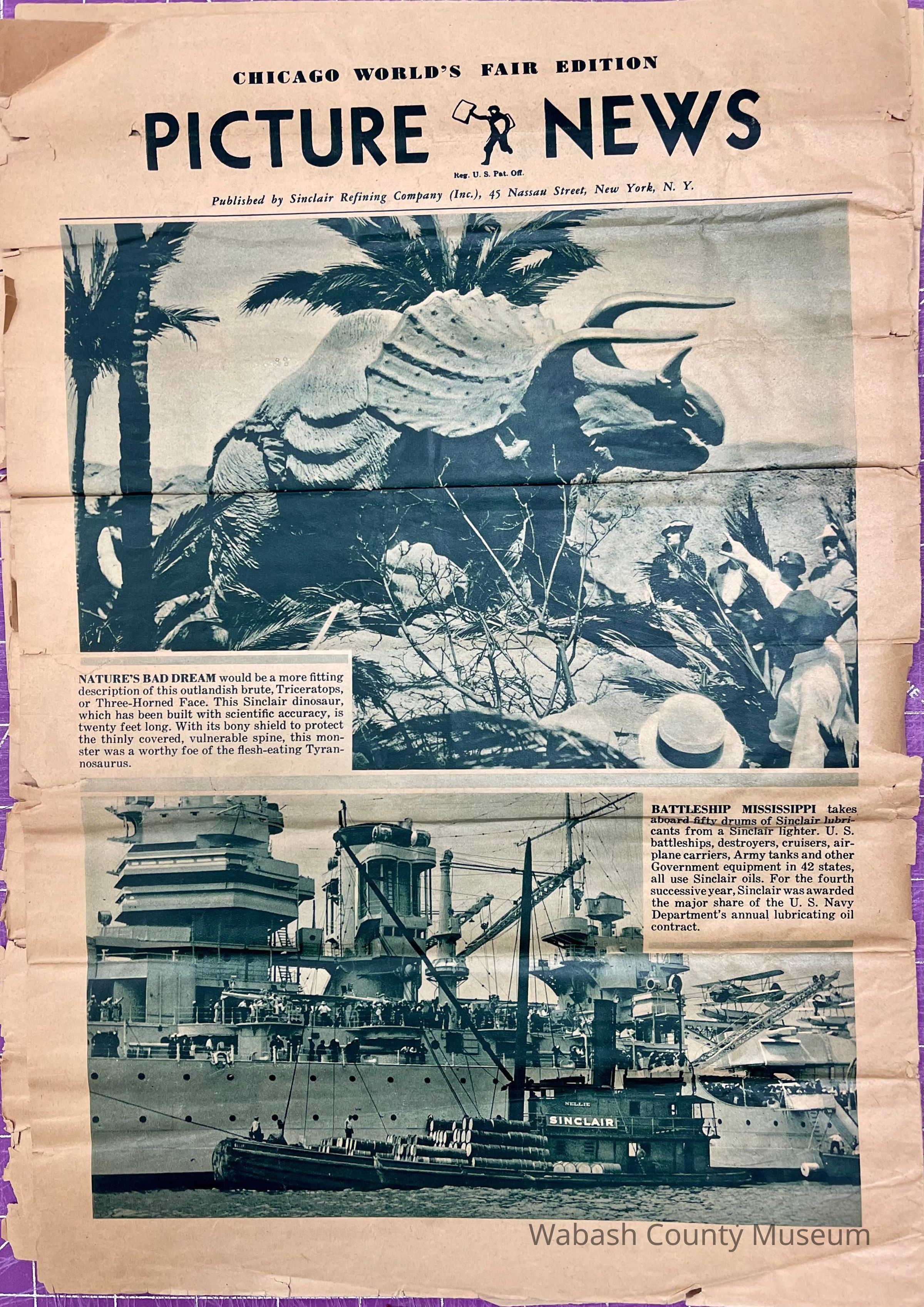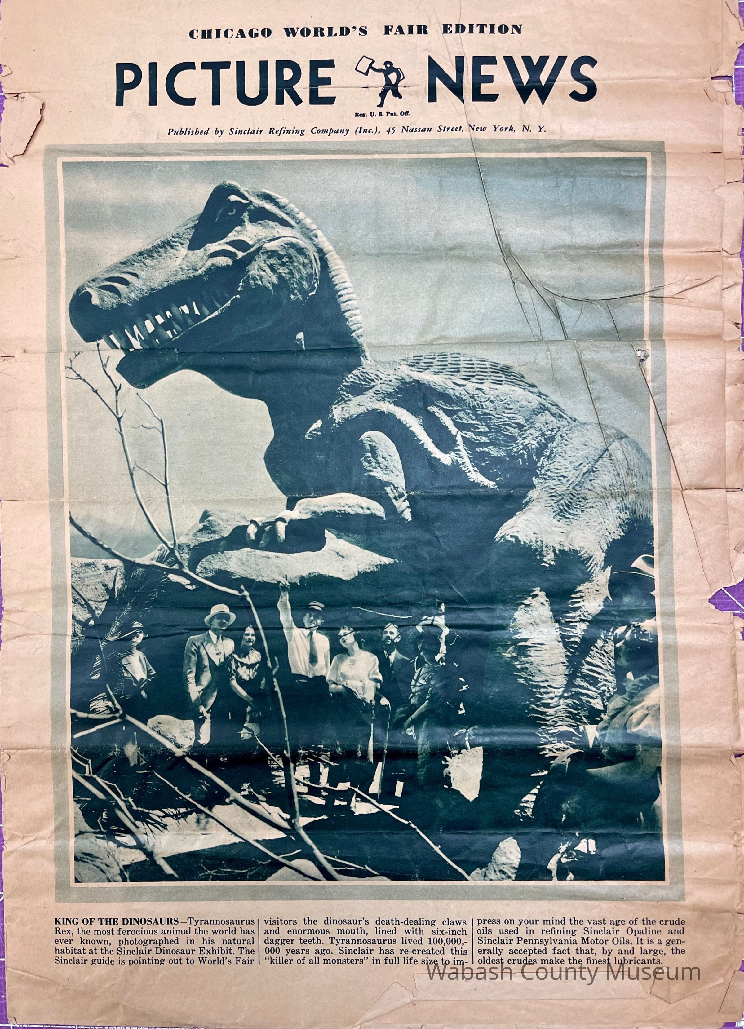 Newspaper published by the Sinclair Refining Company and given away at the 1934 Chicago World's Fair in the Sinclair Dinosaur Exhibit. It's purpose was to impress on the public the age of the crude oils used in refining Sinclair Opaline and Sinclair Pennsylvania Motor Oils.